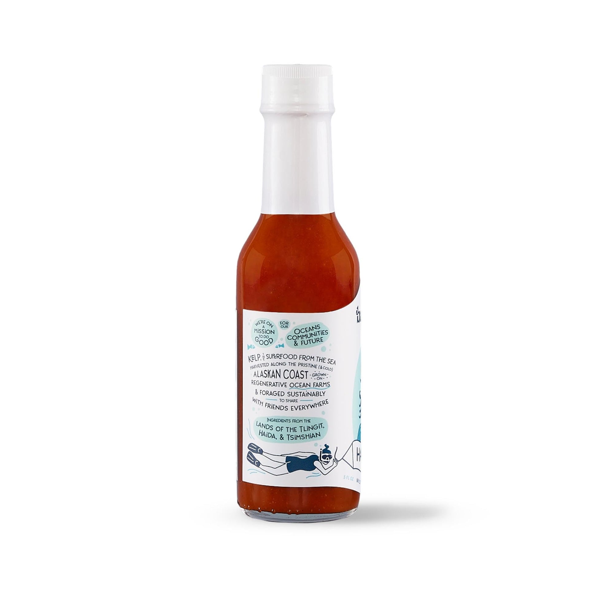 Q: What makes Alaskan kelp a special ingredient in this hot sauce?A: Alaskan kelp is a zero input crop that does not require fresh water or land to grow. It is rich in vitamins, minerals, and iodine, and plays a role in improving ocean health by pulling carbon from the sea.