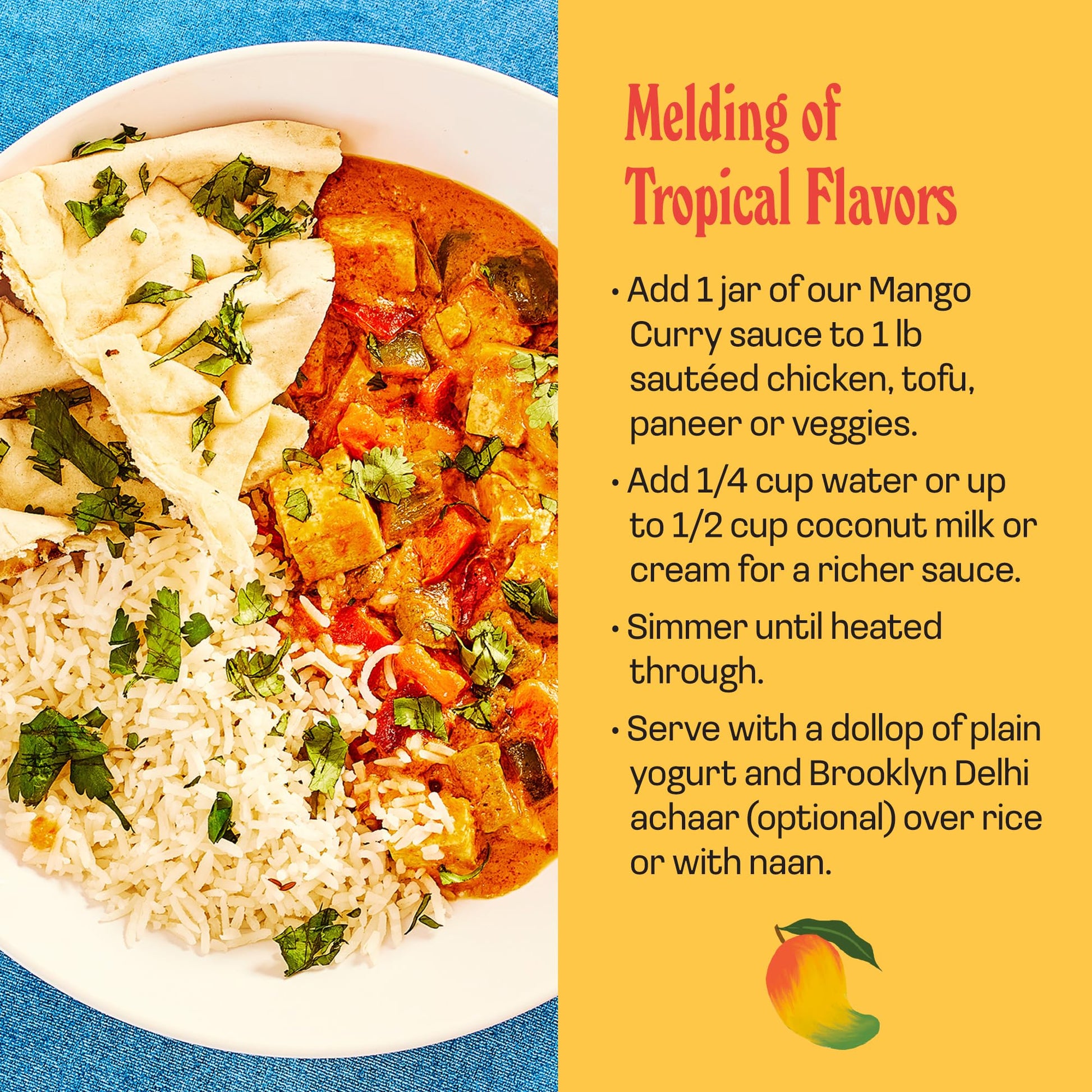 Q: How do I use Brooklyn Delhi Mango Curry sauce?A: To use the Mango Curry sauce, simply add one jar to one pound of your choice of protein, such as chicken or tofu, or your favorite vegetables. Simmer until heated through, and serve over rice or with naan bread for a delicious meal.