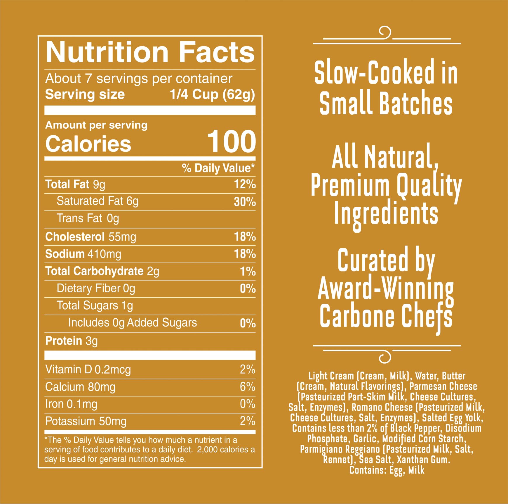 Q: What is the serving size and nutritional information for Carbone Classic Alfredo Pasta Sauce?A: The serving size for Carbone Classic Alfredo Pasta Sauce is typically 1/4 cup. It has zero added sugar and only 5 net carbs per serving, making it a diet-friendly option.