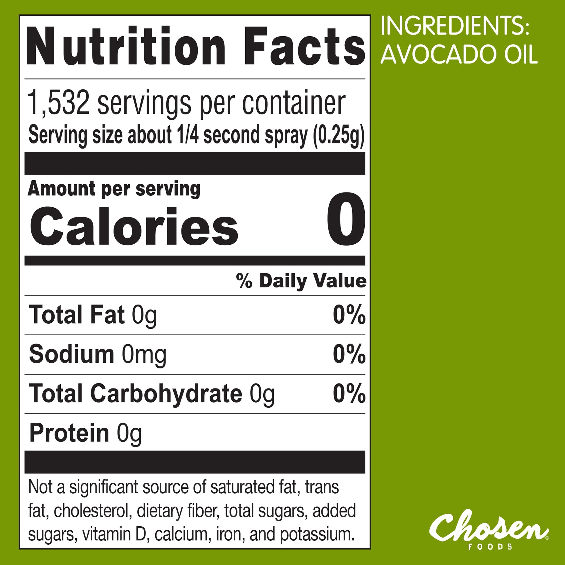 - Q: What sizes are available for Chosen Foods Avocado Oil Spray? A: Chosen Foods Avocado Oil Spray is available in a convenient 13.5-ounce can, sold in a pack of 2, providing ample supply for all your cooking needs.