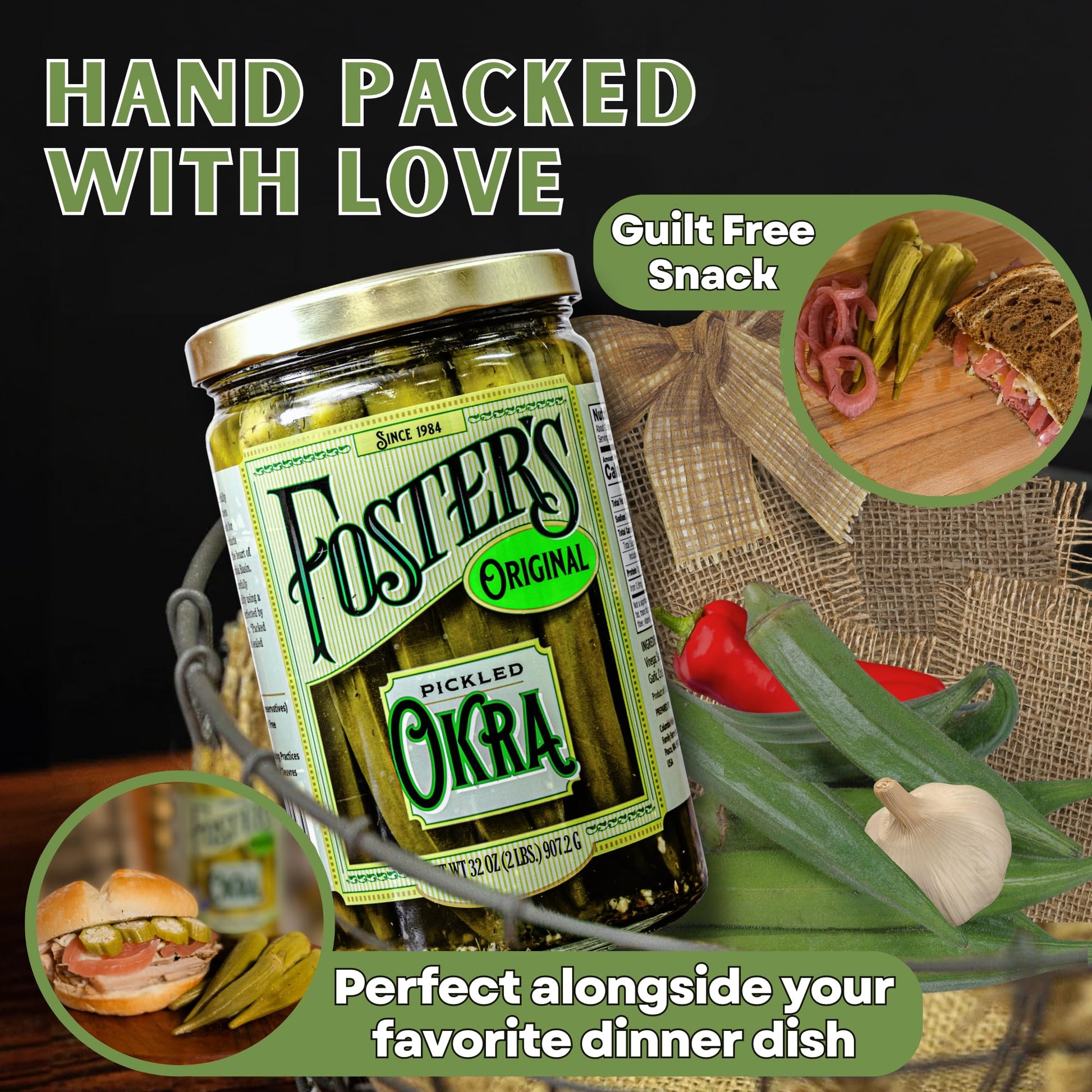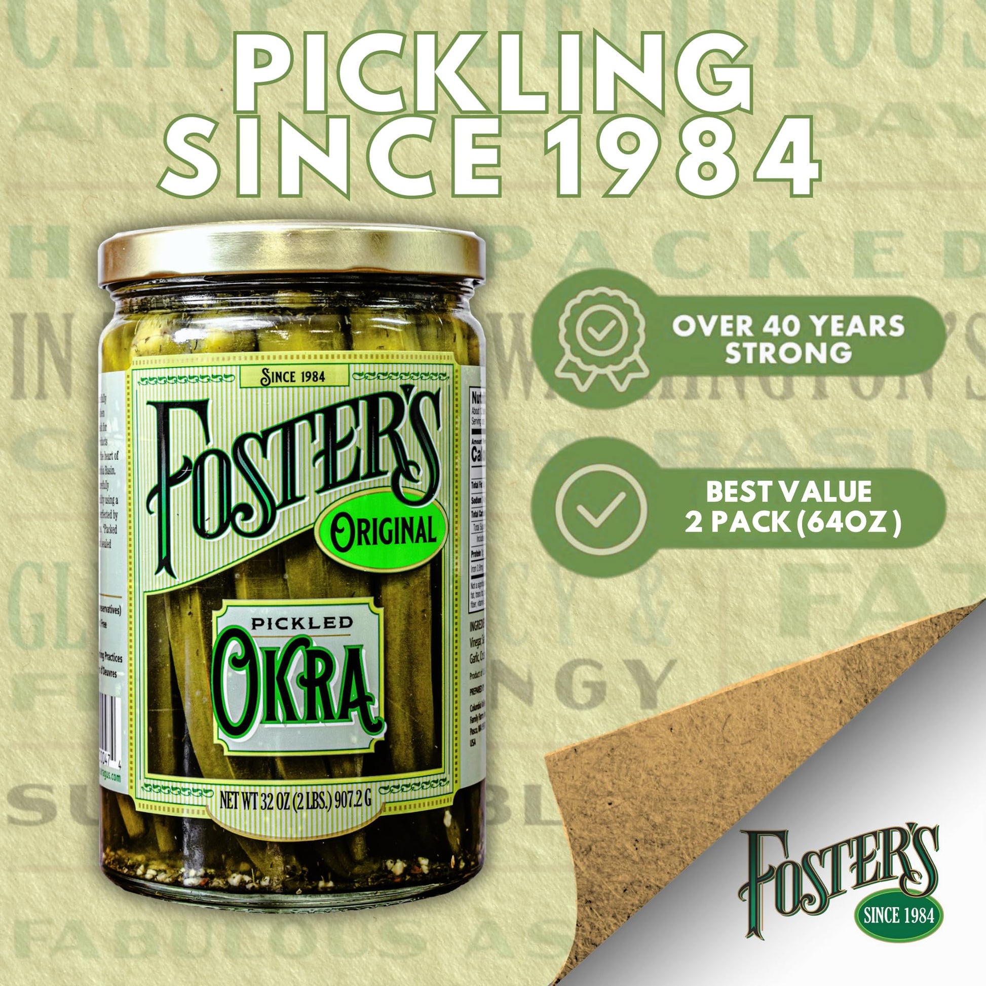 Fosters pickled vegetables are guaranteed to be a treat for your tastebuds! Fosters Pickled Vegetables give you the opportunity to enjoy asparagus, green beans, brussel sprouts, carrots and okra for the whole year rather than just a few short months during harvest. Also, it requires no refrigeration until opened and then it will keep at least 6 more months in your refrigerator.These okra pickles come in Original flavor to satisfy your cravings. Try this delicious snack that is both gluten-free and vegan and vegetarian-friendly.Fosters has been perfecting its pickled vegetables recipe for over 40 years using only the best, locally grown vegetables to deliver the highest quality pickled vegetables to your table.