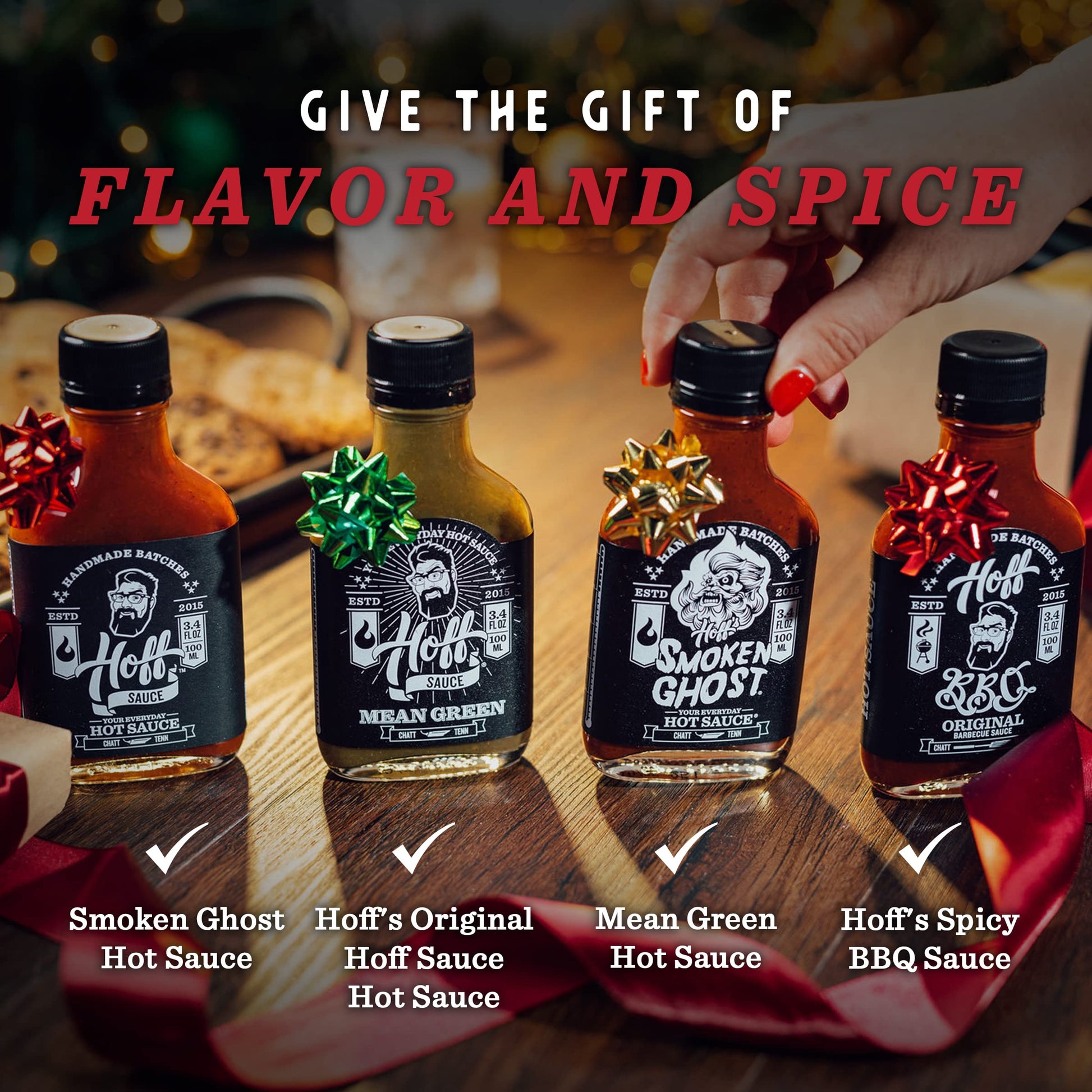 Q: What hot sauces are included in the Hoff Sauce Hot Sauce Gift Set?A: The Hoff Sauce Hot Sauce Gift Set includes four varieties: Hoff Sauce Hot Sauce (Medium Heat Level), Mean Green Hot Sauce (Medium Heat Level), Smoken Ghost Hot Sauce (Hot Heat Level), and Hoff BBQ Molasses Based BBQ Sauce (Mild Heat Level). Each sauce is handmade in Tennessee.