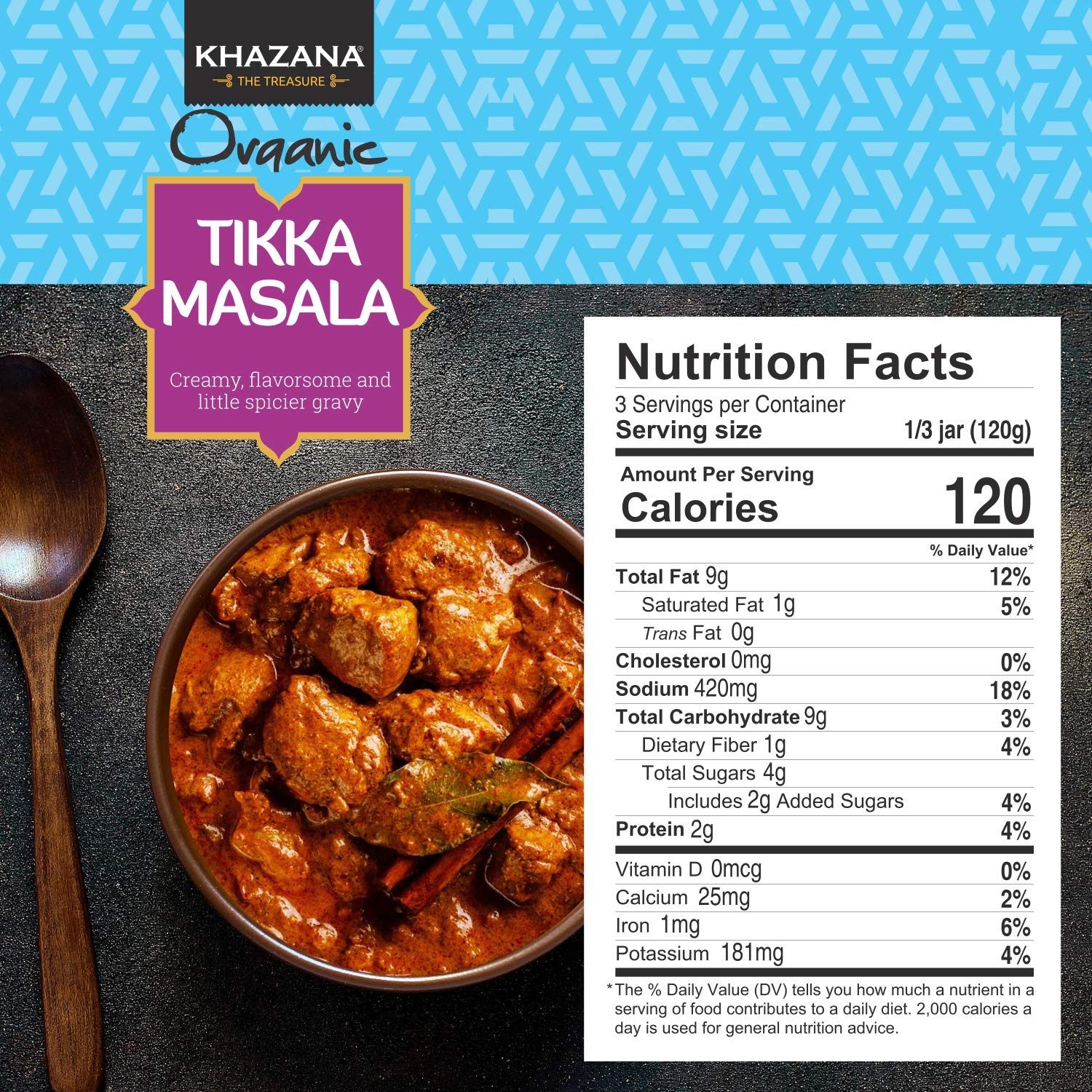 Q: What are the main ingredients in Khazana Tikka Masala sauce?A: Khazana Tikka Masala sauce is made from certified organic ingredients, including a blend of high-quality spices that create a rich, creamy, and aromatic flavor profile.