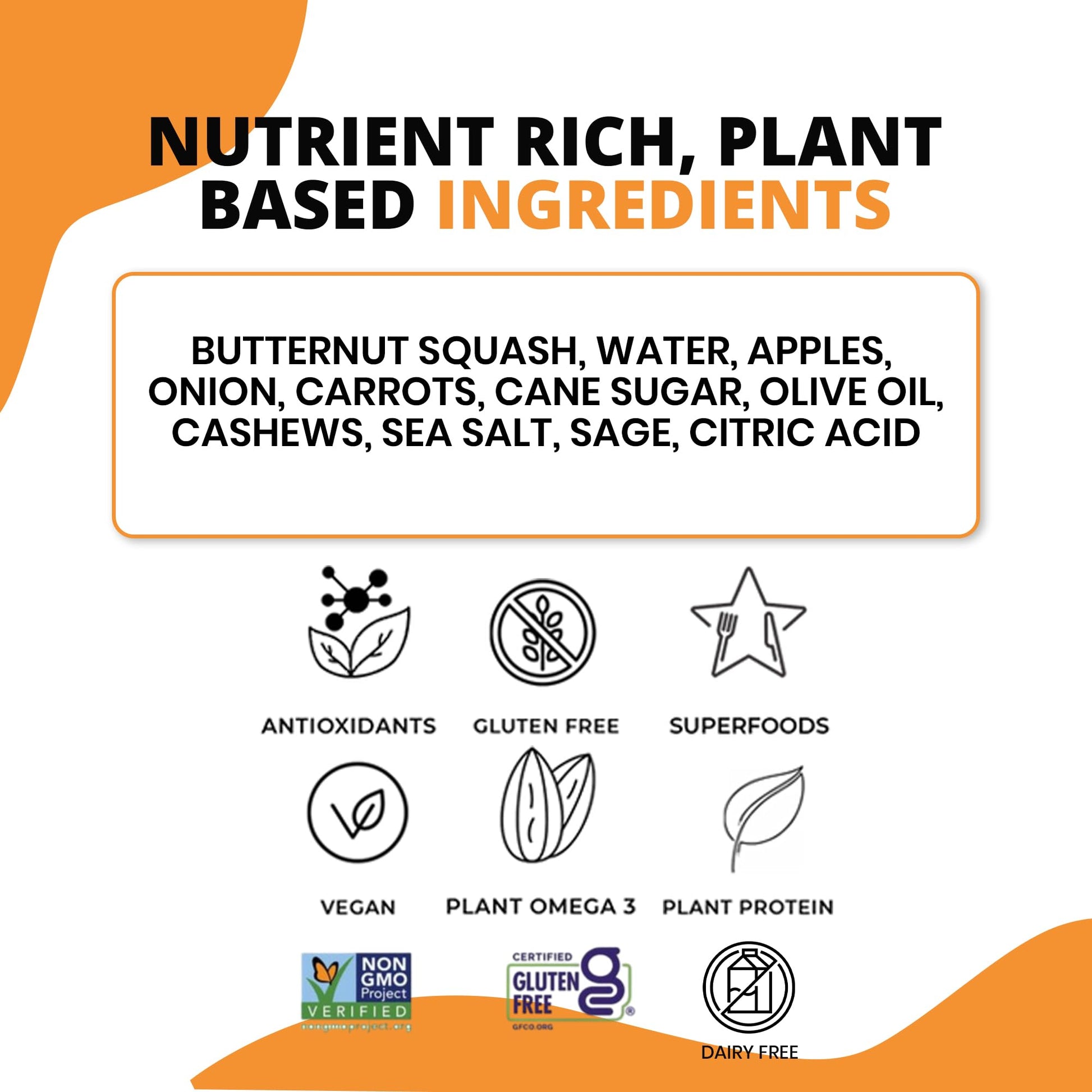 Experience the authentic flavors of Tuscany with our butternut squash sauce. Crafted from butternut squash, olive oil, & savory sage, this creamy vegan pasta sauce makes meals delicious. | Guilt-Free Indulgence - Enjoy creamy, velvety pasta dishes without compromising your health. This plant based butternut squash sauce is a perfect alternative for those seeking indulgence without the guilt. | Extremely Versatile - Transform your culinary creations with this creamy sauce! Whether drizzling it over pizza, tossing it with pasta, or using with flatbread, this unique butternut sauce elevates any dish. | Simplifies Healthy Cooking - Busy day? No problem! This healthy pasta sauce is perfect for creating quick, healthy meals without sacrificing flavor. It