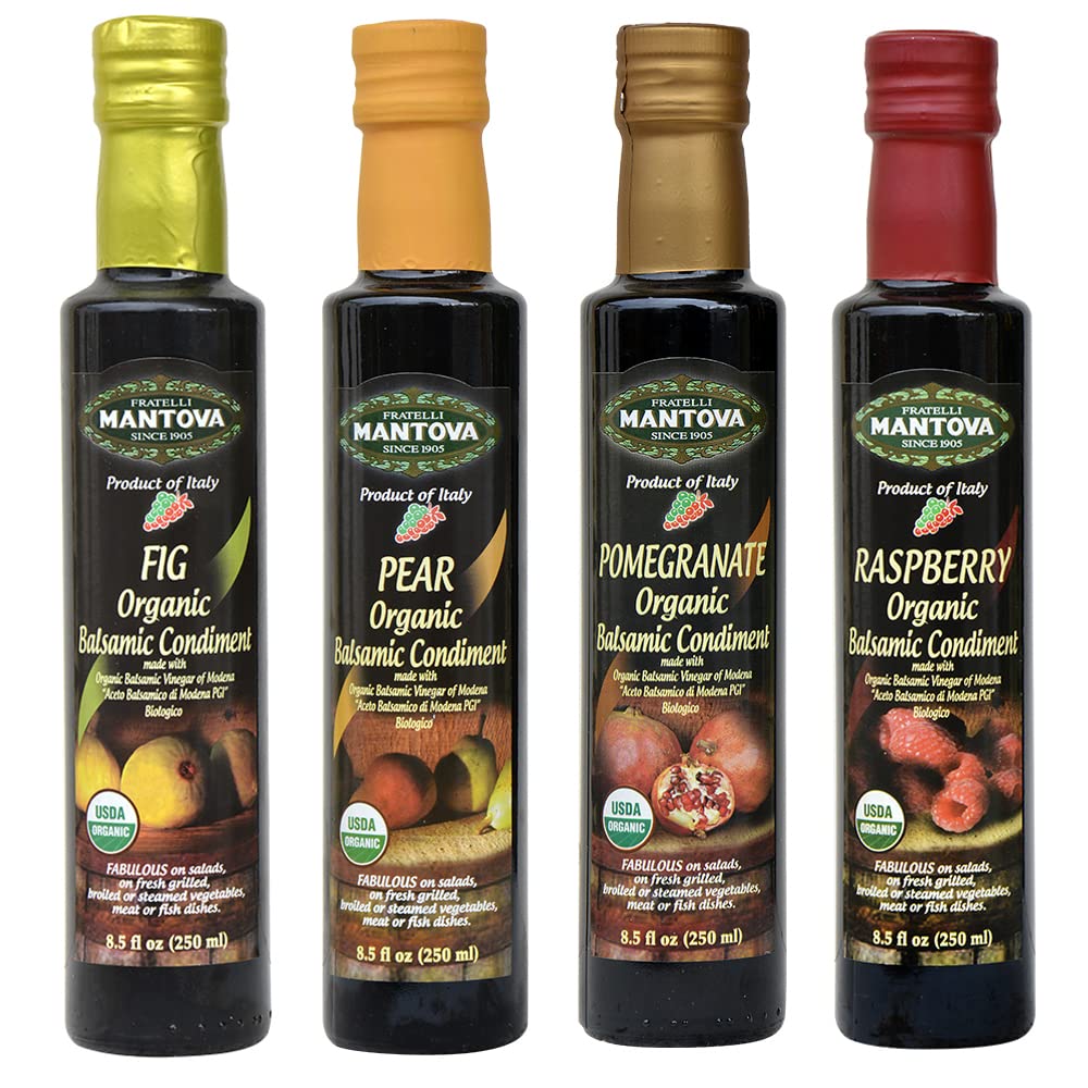 Mantova Organic Flavored Balsamic Vinegar Of Modena 4-Variety Pack: Fig, Pear, Pomegranate, & Raspberry; Perfect For Gift Basket, Add To Pasta, Salad, Ice Cream And Cocktails, 8.5 Oz Per Bottle
