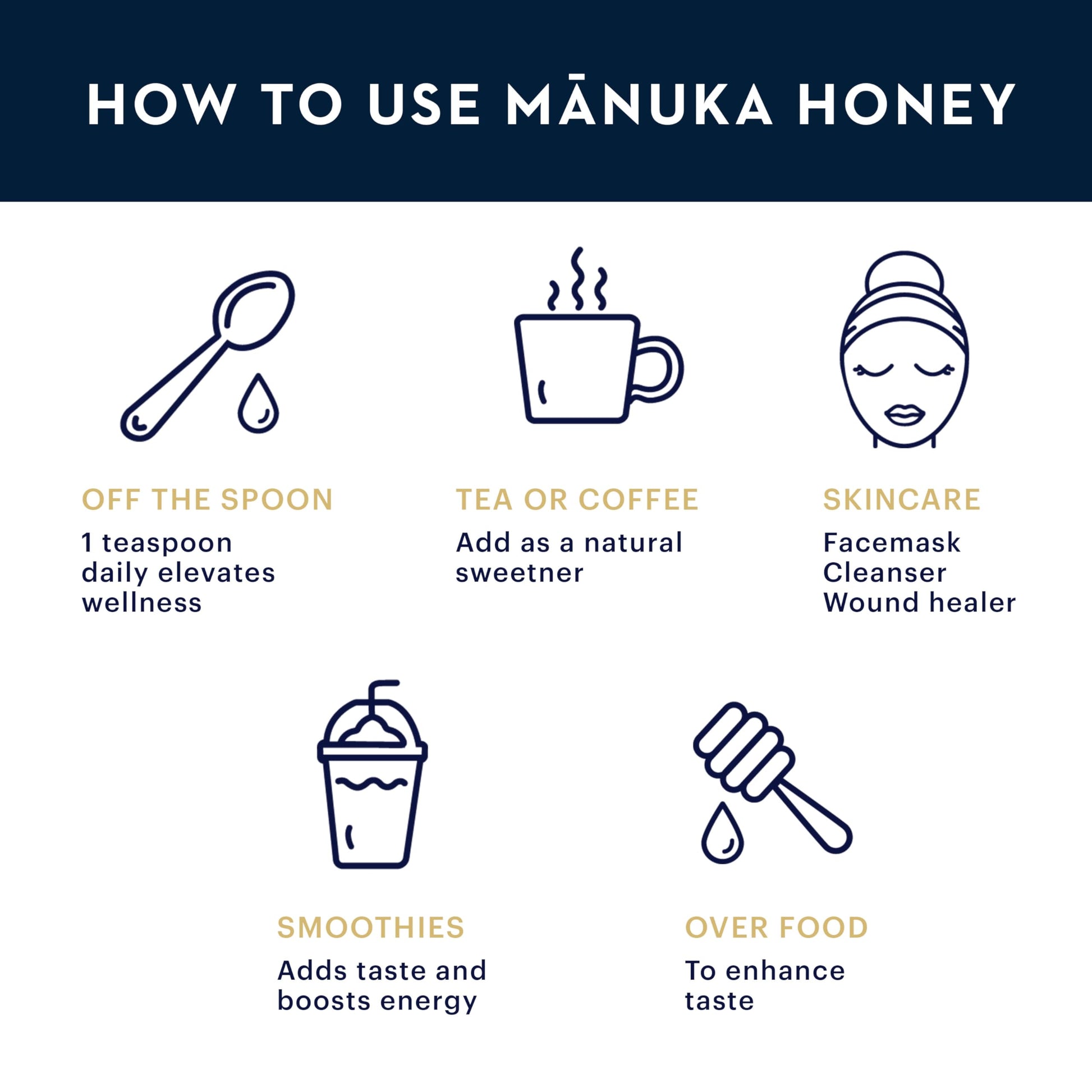 - Q: How can I use Manuka honey in my daily routine? A: Manuka honey is a versatile superfood that can be enjoyed in various ways. You can drizzle it on toast, mix it into smoothies, or use it as a natural sweetener in beverages. Additionally, it can be applied topically for skincare or consumed to soothe digestive issues.