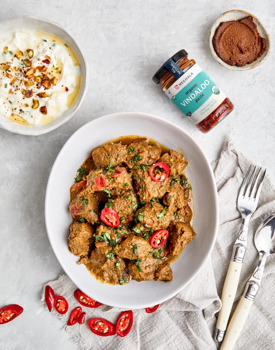 Q: How can I use Mekhala Vindaloo paste in my cooking?A: You can use Mekhala Vindaloo paste as a cooking paste for curries or as a marinade for various proteins and vegetables. It pairs well with sweet potato, tofu, beef, lamb, eggplant, pork, chicken, and lentils.