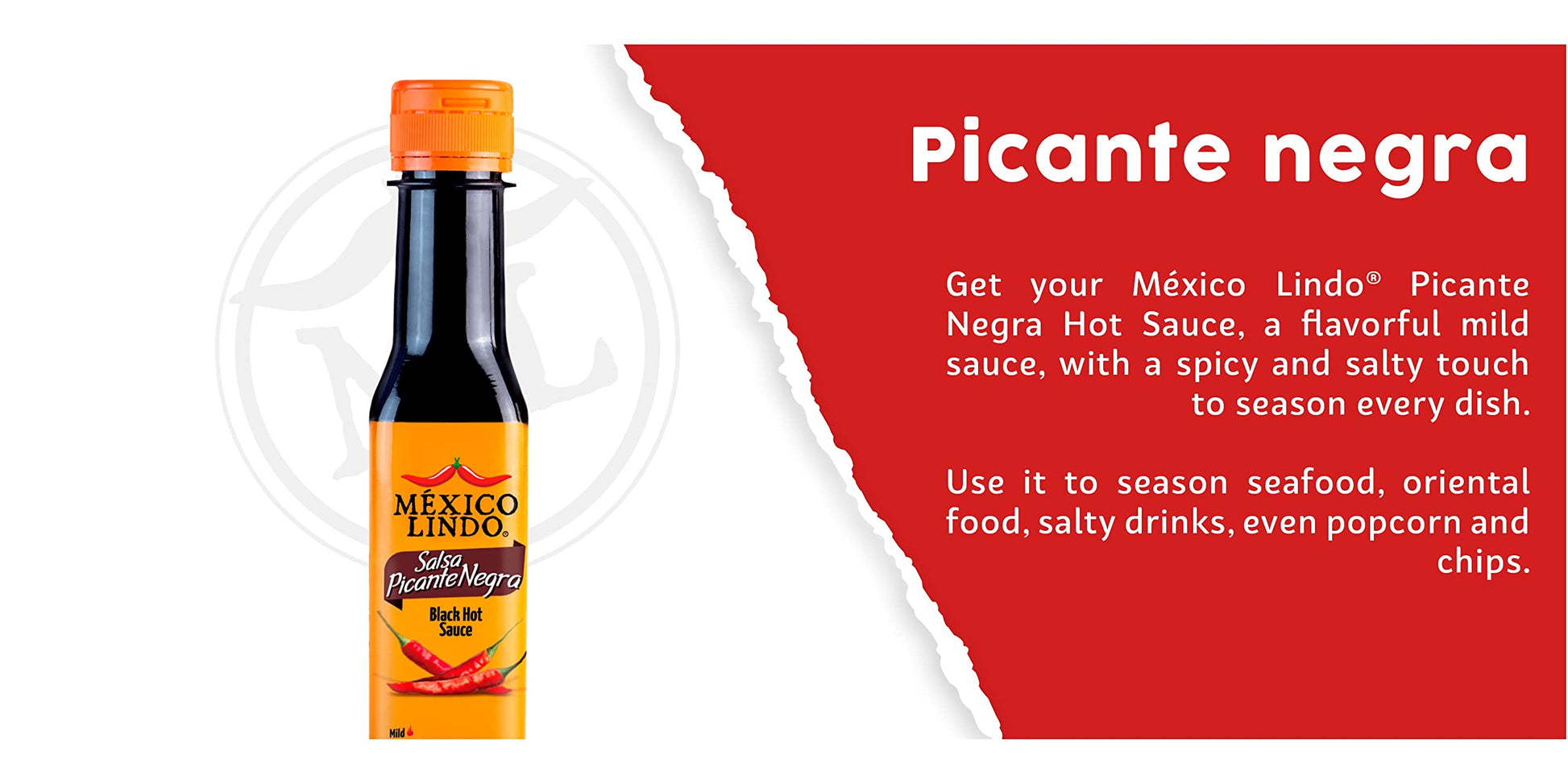 A new and creative way of presenting a Mexican mixture containing soy sauce and Mexican peppers, Mexico Lindo Picante Negra hot sauce can be used on seafood, oriental food, meat, poultry, snacks or even as a great cooking marinade. Just marinate your favorite food overnight and experience a new dimension of flavors! This soy seasoning sauce with a light but delicious spicy touch is the new favorite ingredient for lovers of good food. Mexico Lindo provides authentic taste for any meal. Suitable for the whole family, Picante Negra is the perfect blend for seafood, oriental food, meat, poultry, and snacks. Heat level: Mild.