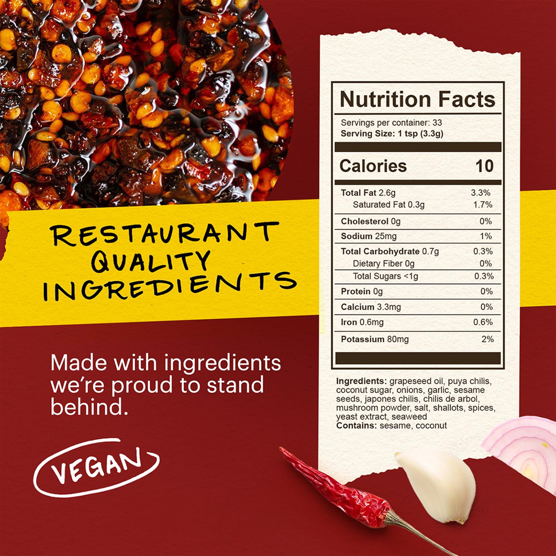 Momofuku Chili Crunch is a spicy-crunchy chili hot oil from David Chang. It’s our go-to way of adding a flash of heat and texture to our favorite dishes. Chili Crunch is restaurant-tested and the result of a decade of research. With three types of Mexican chilis, crunchy garlic and shallots, Chili Crunch is the perfect balance of spicy and crunchy. An Umami base builds on a decade of research in the Momofuku Culinary Lab, Chili Crunch is packed with the same umami-rich ingredients we use in our restaurants. It’s inspired by Chinese chili crisp and crunchy Mexican salsas like salsa macha and salsa seca. Pepper power is in every layer of the product, from the base, we layer in three different chilis for a complex smoky-sweet punch. The Pulla brings a bright fruitiness. The Chili de Arbol adds a nutty smokiness. And the Japones closes with a lingering spiciness. Crunch factor is created when we add in crispy dried garlic and shallots. They give Chili Crunch an addictive texture that ensures no two bites are the same.