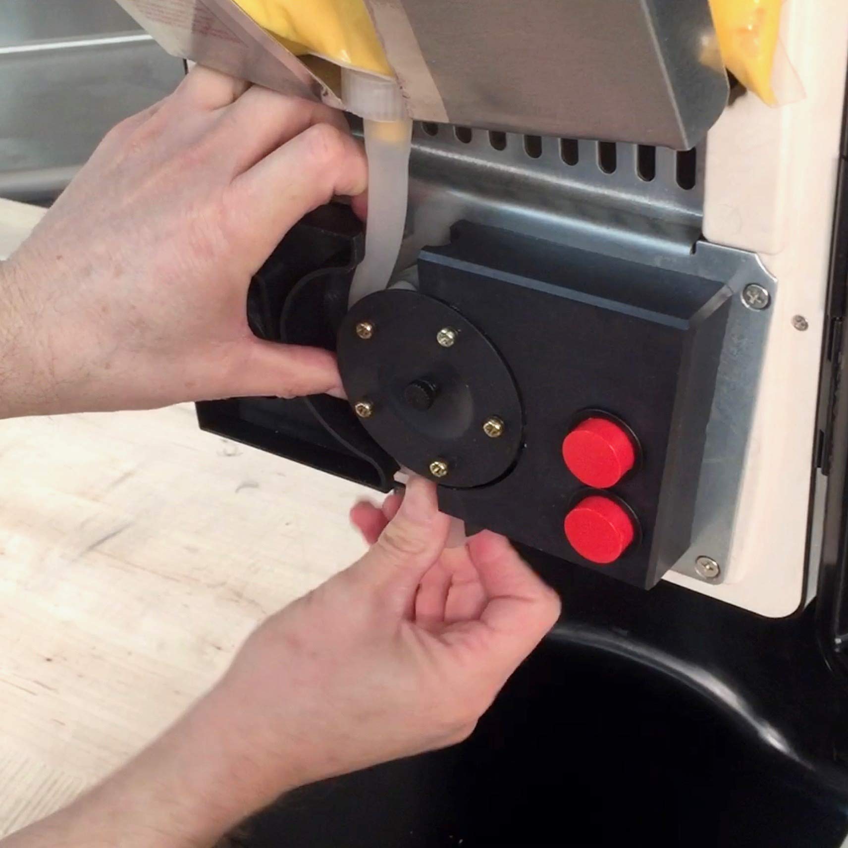 Q: How do I properly use the disposable pouches for heating the cheese sauce?A: To use the disposable pouches, preheat the bag, then pierce it with the included sharp dispensing tube, install the bag in the heater, clamp the tube into the peristaltic pump, and enjoy your cheese sauce.