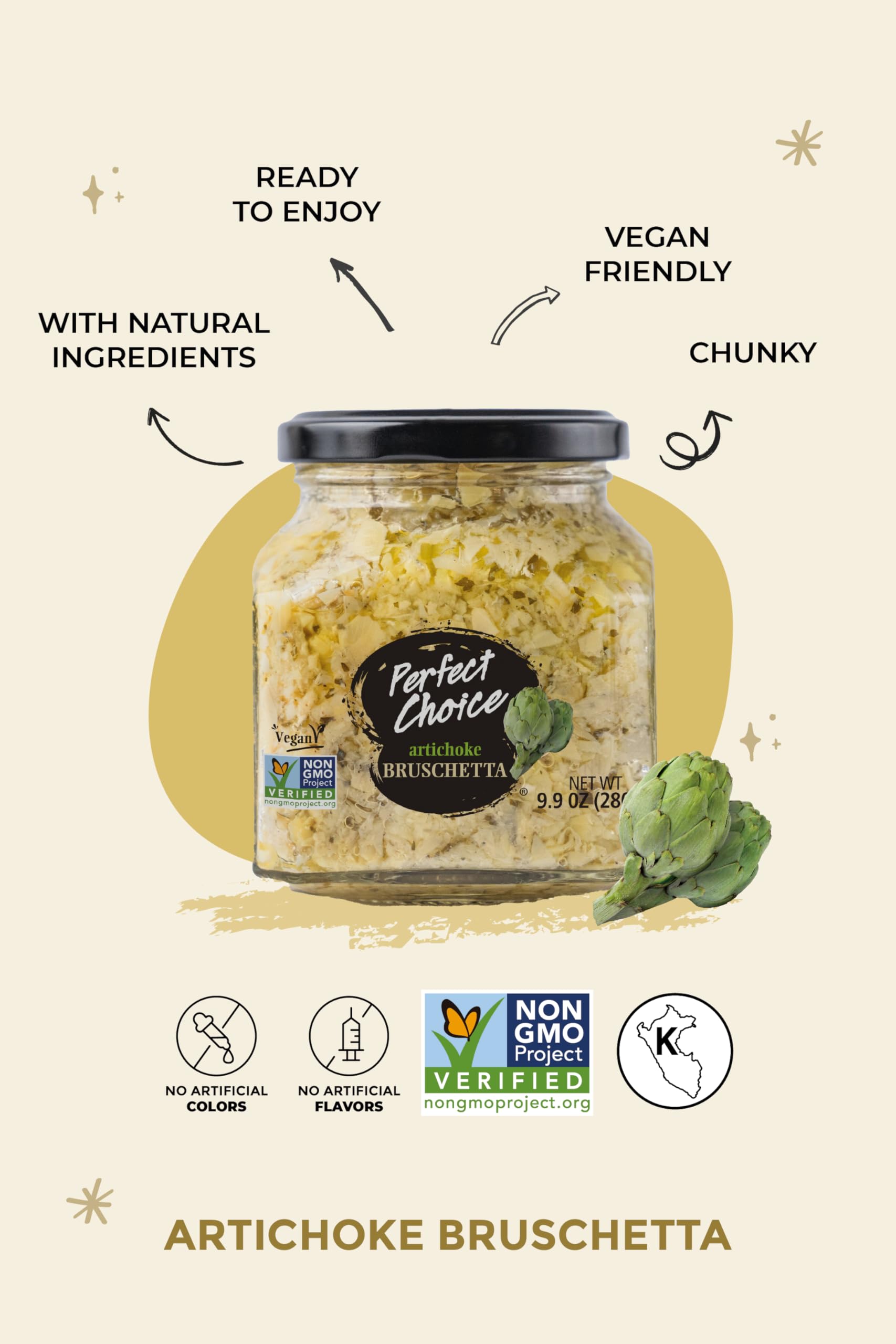 Q: What is Perfect Choice Artichoke Bruschetta made of?A: Perfect Choice Artichoke Bruschetta is made with high-quality ingredients, including natural artichoke hearts, and is crafted to be vegan-friendly and non-GMO. It contains no artificial colors or flavors, ensuring a wholesome product.
