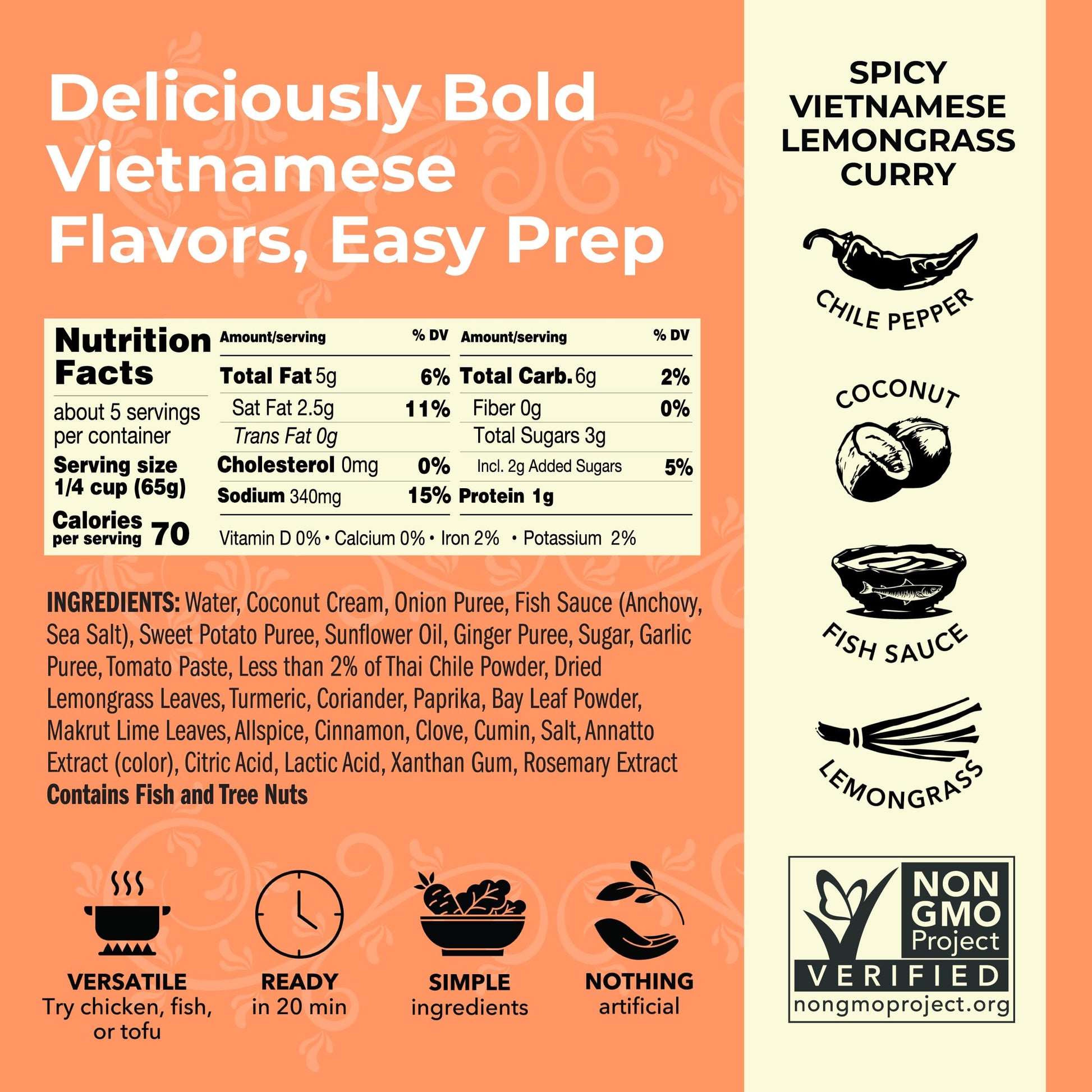 - Q: How many servings does one jar of this curry sauce provide? A: One jar of Red Boat Spicy Vietnamese Lemongrass Curry makes a satisfying meal for a family of 3-4, making it a great option for family dinners or gatherings.