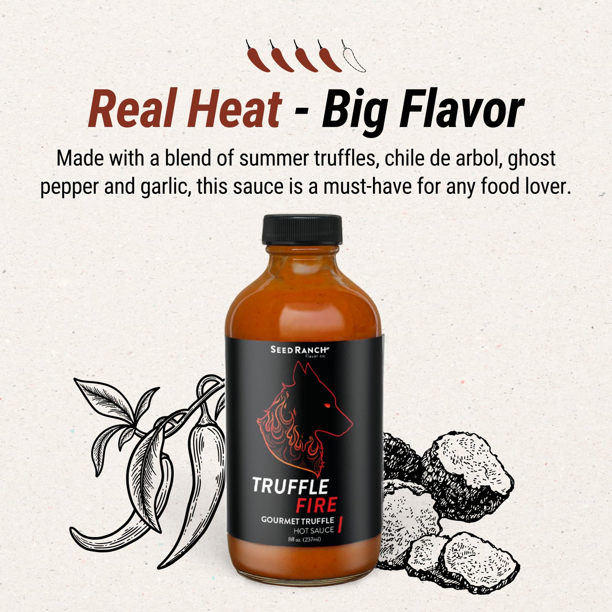 Experience the perfect fusion of savory truffle flavor and fiery heat with Truffle Fire hot sauce from Seed Ranch. A special spicy version of Seed Ranchs Truffle Hound. This gourmet sauce is expertly crafted with a unique blend of summer truffles, chile de arbol, and ghost pepper, offering a tantalizing twist to your meals. The distinct flavor of carolina reaper adds a bold spicy kick, making this sauce an absolute must-have for every food enthusiast. Whether youre spicing up a burger, marinading chicken, adding a kick to your pasta sauce, or looking for the perfect pizza sauce, Truffle Fire is your go-to choice. Our Truffle Fire hot sauce is not just about taste, its about embracing a healthy lifestyle. Unlike many hot sauces on the market, Seed Ranch products are vegan and made without GMOs, gums, preservatives, or artificial sugars. Plus, our hot sauce is incredibly user-friendly. Theres no need for refrigeration - simply store in a cool, dry place. And dont worry if you notice some separation, its completely natural. Just give your bottle a good shake before you use it. So why wait? Add some Truffle Fire hot sauce to your pantry and elevate your culinary experiences!