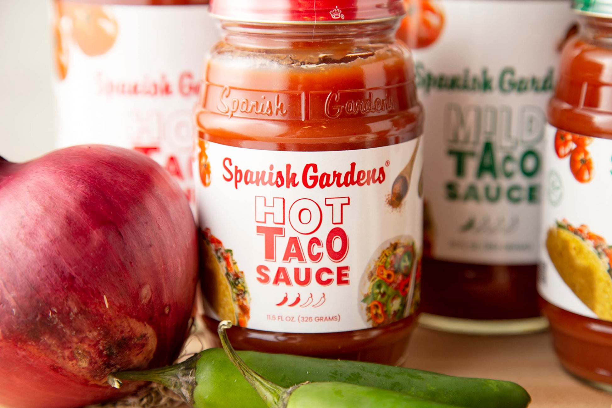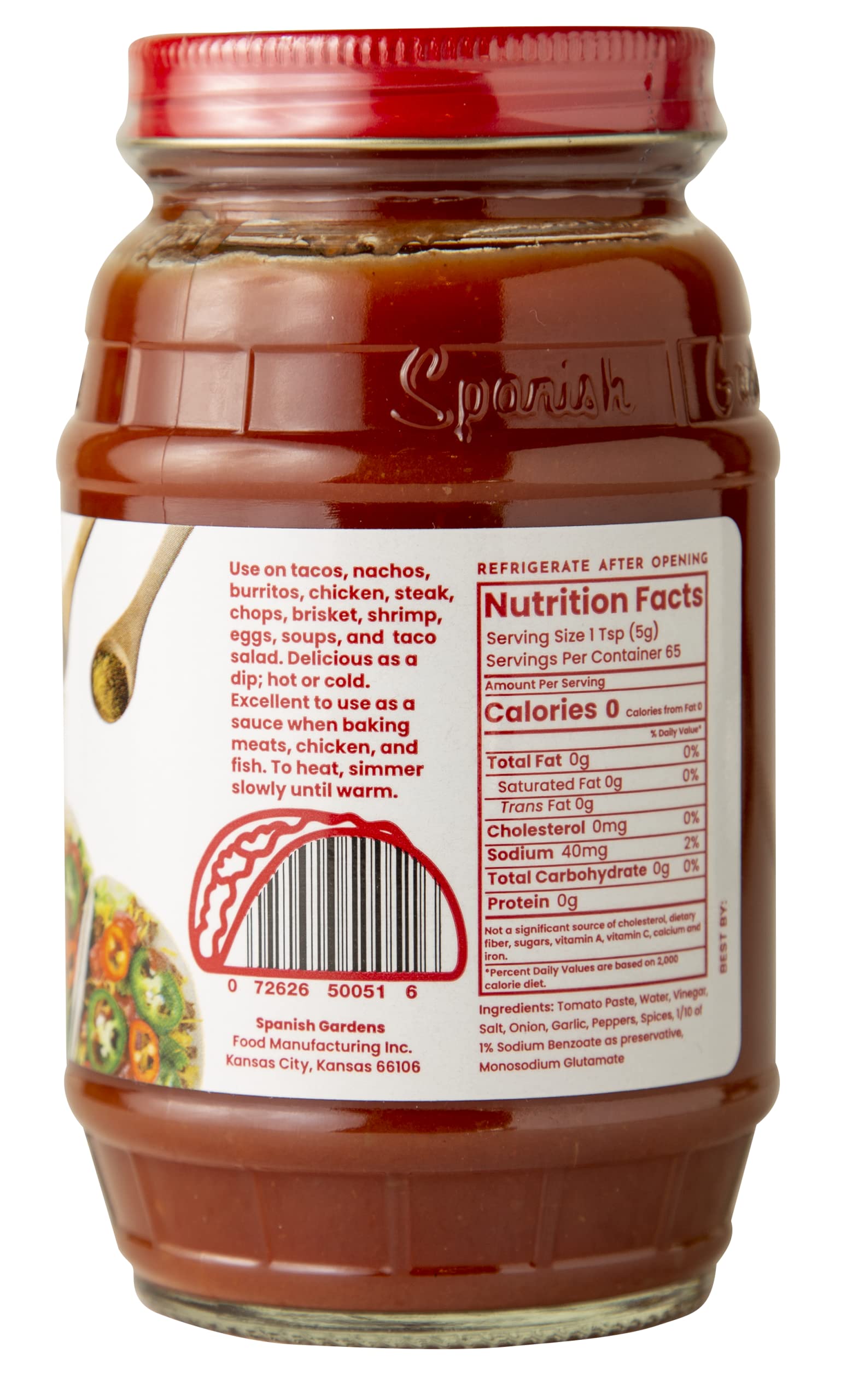 Spanish Gardens Taco Sauce: Enhance your taco nights with authentic zest! Relish the bold flavors of traditional Mexican cuisine with Spanish Gardens Taco Mexican Sauce. Our sauce is a fiery blend of tomatoes, peppers, onion, and garlic, crafted from an original family recipe. Each bottle delivers a smooth, full-bodied taste thats essential for a complete taco kit. Dive into the rich heritage of Mexican food, as our mild sauce pairs impeccably with both Mexican and Tex-Mex dishes. Experience the perfect heat in every drop! Dial up the intensity of your next meal with our carefully crafted sauces. Whether youre whipping up tacos, nachos, enchiladas sauce, or burritos, Spanish Gardens Mild Taco Sauce bottle delivers a rich, profound zest that elevates every dish. Moreover, its fat-free, ensuring guilt-free enjoyment. Versatile and delicious, our spicy taco sauce isnt just a sauce! Its ideal for enhancing all your favorite Mexican dishes, from casual family dinners to lively gatherings with friends. So why wait? Add a splash of authentic flavor to your meals and experience the true taste of Mexico with Spanish Gardens Beef Taco Sauce. - About Us: Spanish Gardens has strong roots in the Kansas City community. Our grandfather, Luis Silva, a native of Guadalajara, Mexico, opened his restaurant in Argentine, Kansas City, Kansas, in the 1950s featuring family recipes such as tacos, enchiladas, burritos, tamales, and a customer favorite, Mexican Chili. All family dishes were served with our signature taco sauce. Our taco sauce quickly became a local favorite, and he soon began spending most of his time bottling sauce and making tortillas to fill the overwhelming requests.