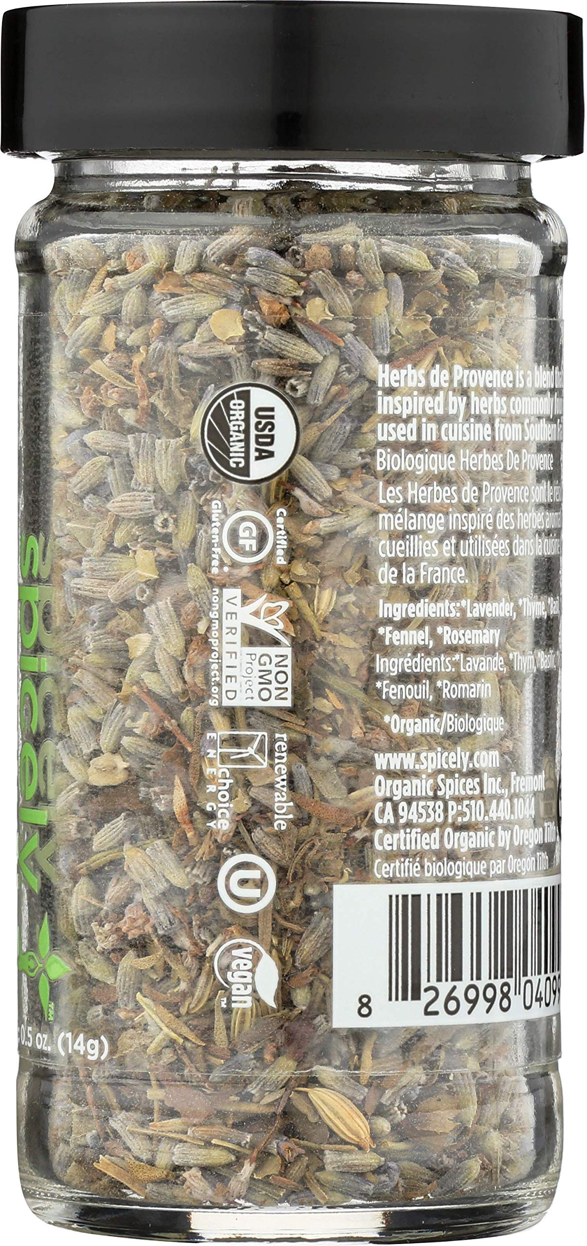 - Q: What ingredients are in Spicely Organic Seasoning Herbs De Provence? A: Spicely Organic Seasoning Herbs De Provence contains organic thyme, organic lavender, organic basil, organic marjoram, organic fennel seeds, and organic rosemary. These pure ingredients are carefully sourced to ensure high quality and flavor.