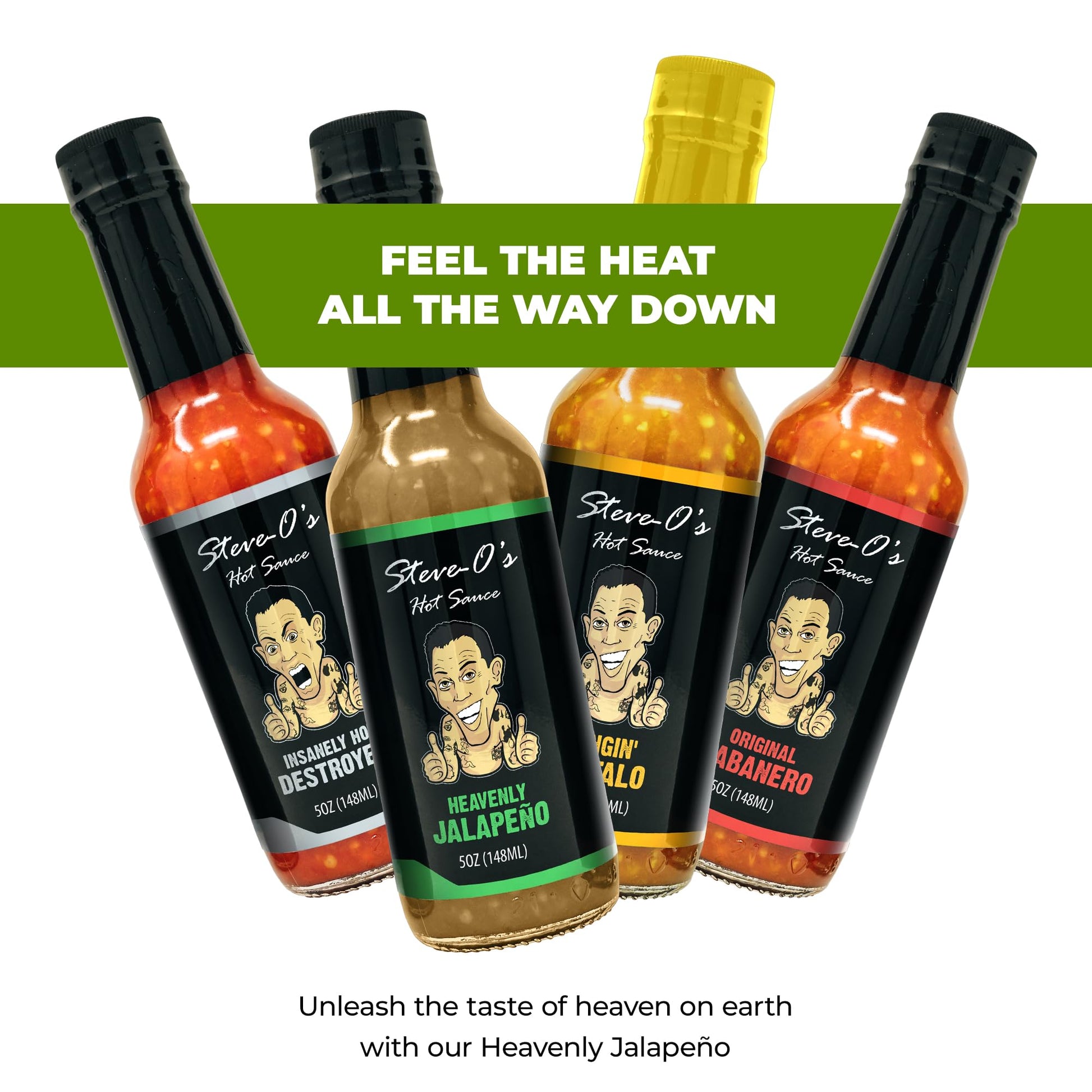 - Q: What is the size of the packaging for this product? A: Steve-O's Heavenly Jalapeño Hot Sauce comes in a convenient 5 fl oz bottle, and it is available in a 12-pack, making it perfect for stocking up or sharing with friends and family.
