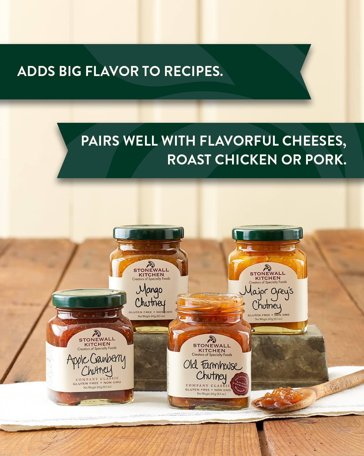 - Q: What are the flavors included in the Stonewall Kitchen Our Chutney Collection? A: The Stonewall Kitchen Our Chutney Collection includes four delicious flavors: Old Farmhouse Chutney, Apple Cranberry Chutney, Mango Chutney, and Major Grey's Chutney, each in an 8.5 oz jar.