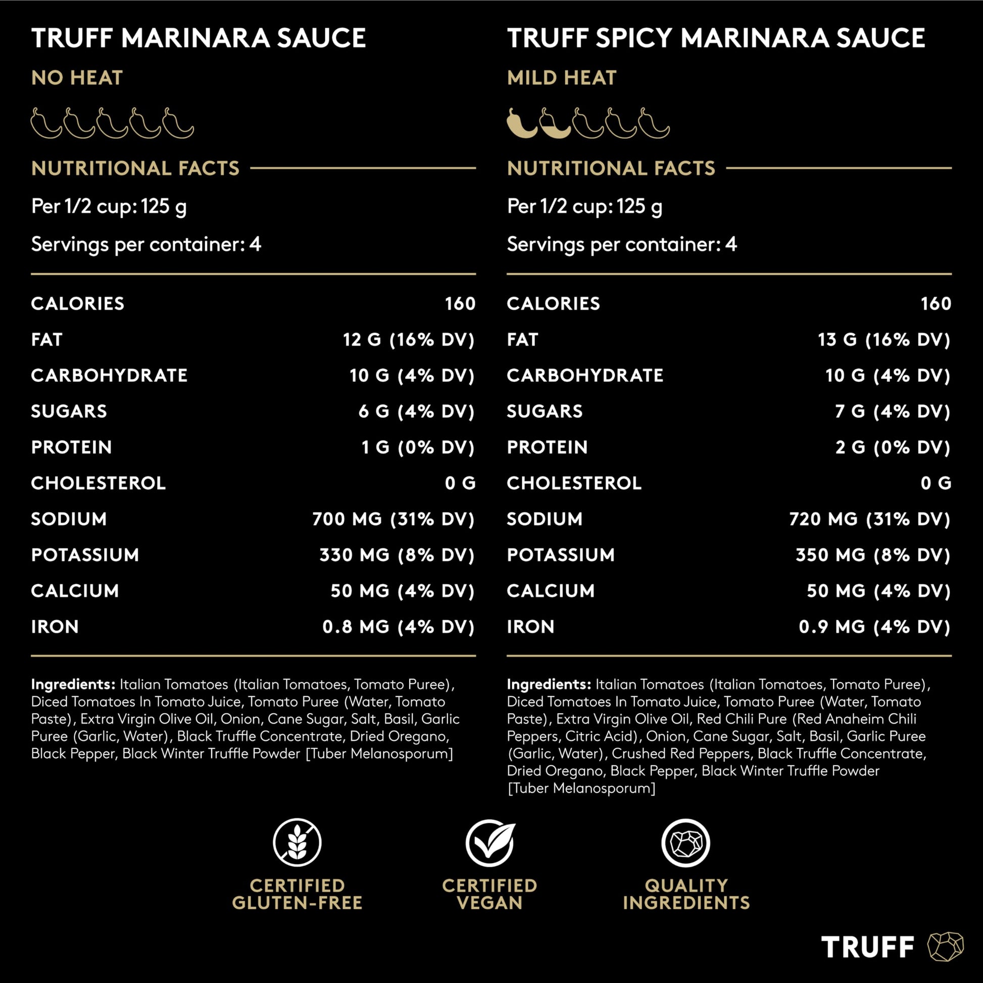 Q: What is the difference between the Black Truffle Marinara and Spicy Marinara sauces?A: The Black Truffle Marinara is a mild sauce perfect for those who prefer a hearty flavor without heat, while the Spicy Marinara offers a gentle kick of heat for those who enjoy a bit of spice in their dishes.