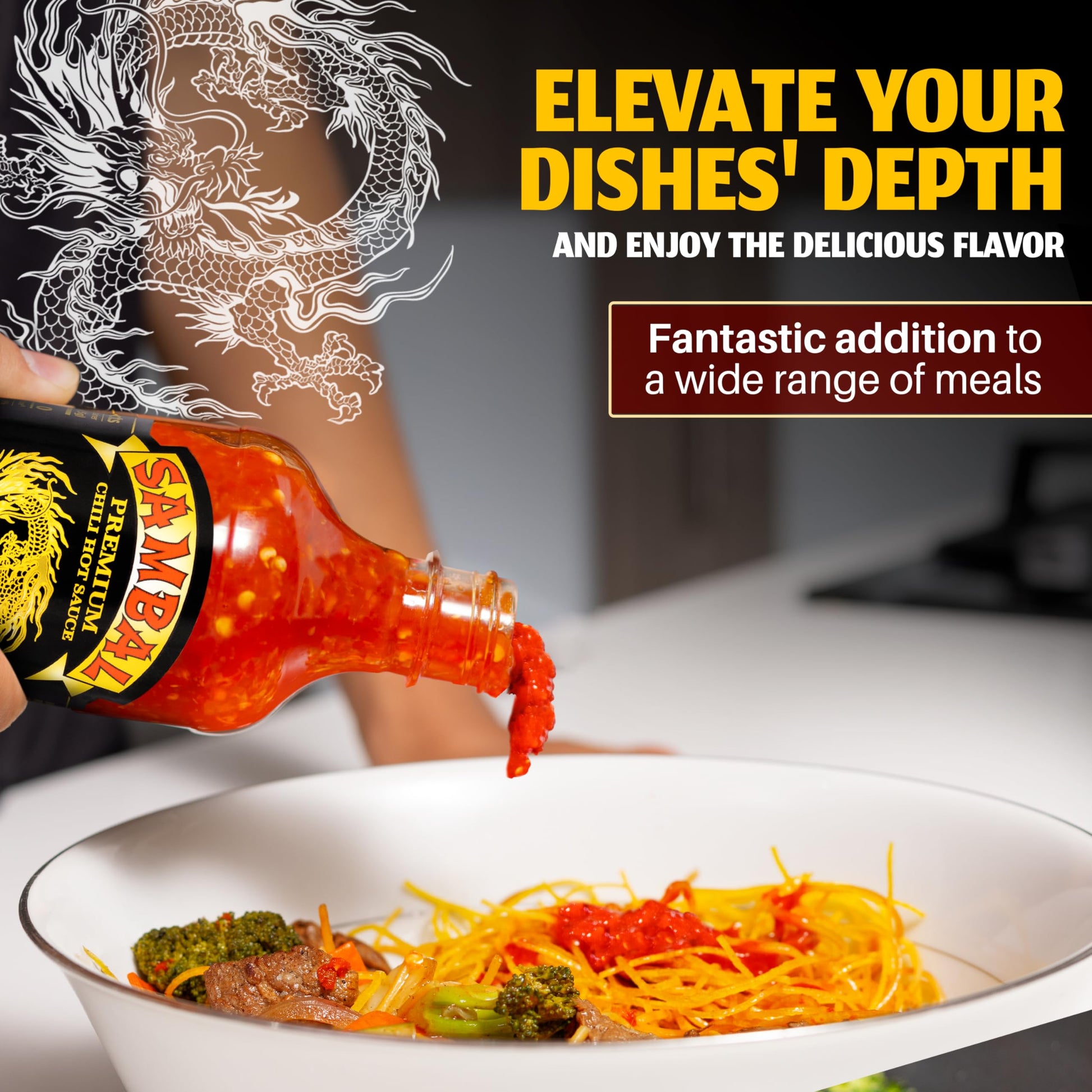 Q: How should I use Dragon Sambal Sauce in my cooking?A: This versatile sauce can be used as a dipping sauce, marinade, or condiment, enhancing a wide variety of dishes such as eggs, burgers, noodles, and stir-fry.