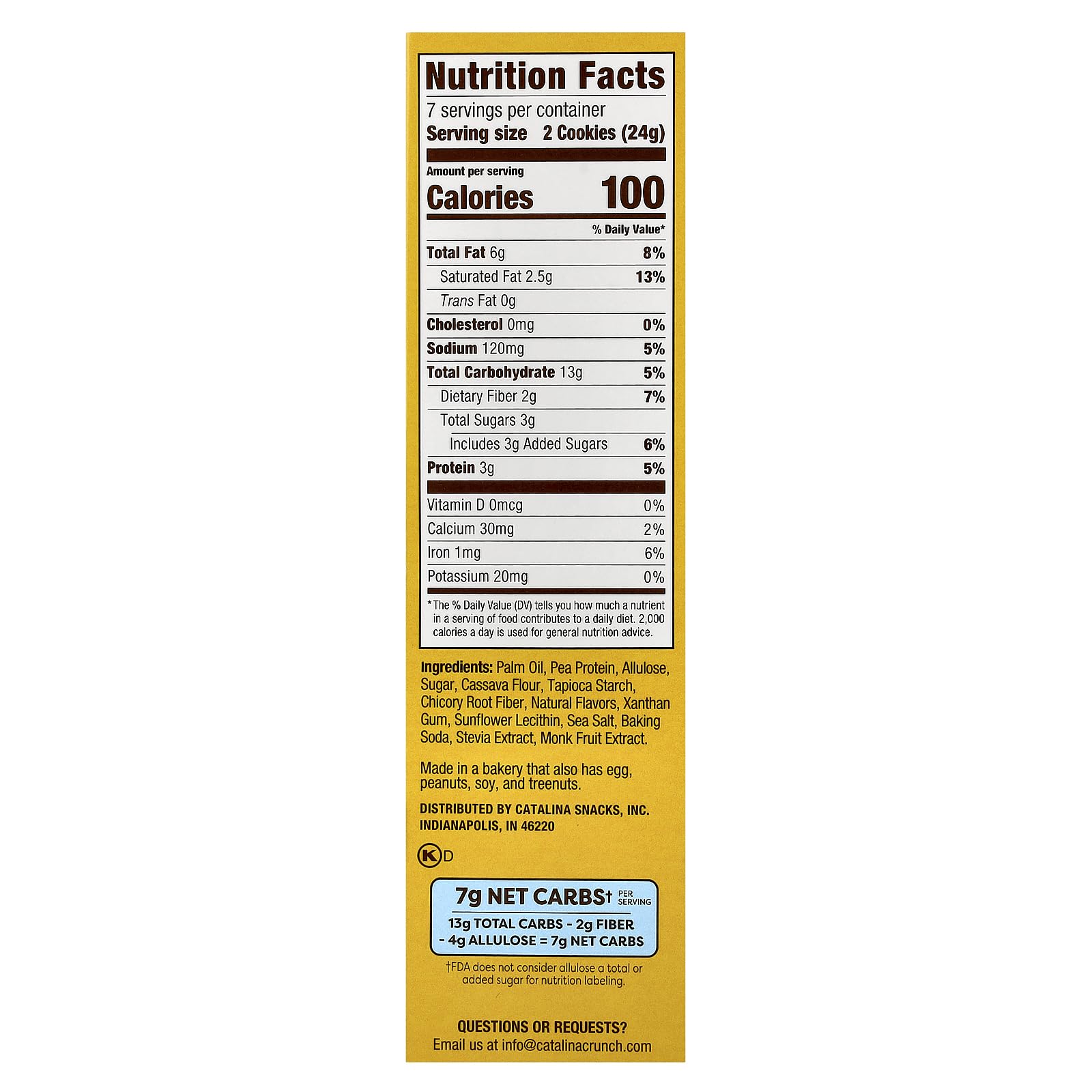 Q: How much protein is in each cookie?A: Each Catalina Crunch cookie contains 2 grams of protein, providing a satisfying and energizing treat to help keep you full throughout the day.