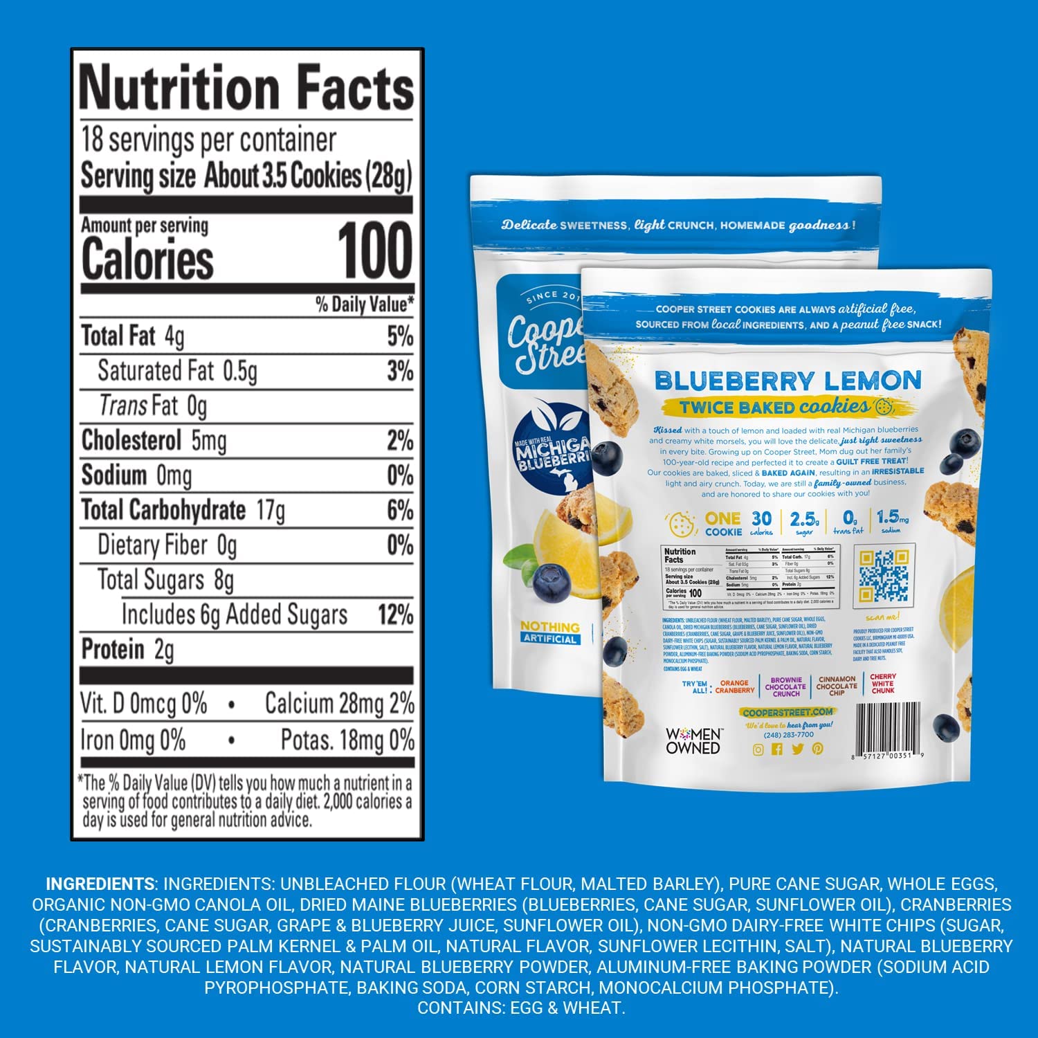 Q: What are the main ingredients in Cooper Street Cookies?A: Cooper Street Cookies are made with all natural ingredients and contain no artificial colors or flavors, ensuring a wholesome snack option.