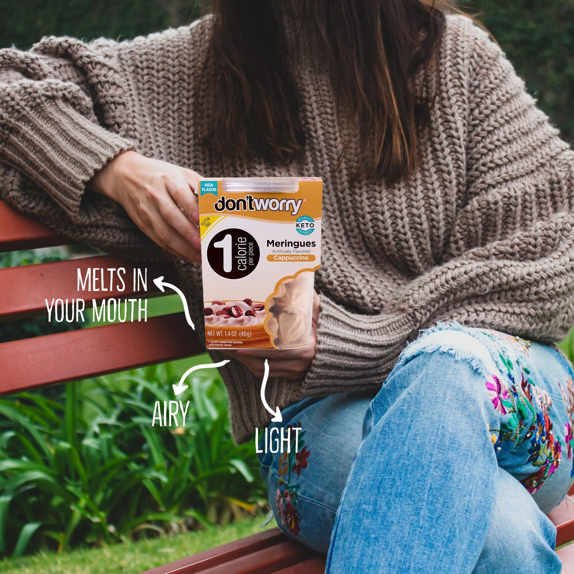 - Q: What makes these meringue cookies different from regular cookies? A: Unlike regular cookies that can be high in calories and sugar, Don't Worry Low Calorie Meringue Cookies are designed to deliver maximum indulgence with just 1 calorie per piece. They maintain a light, airy texture and are crafted with a unique formula to replicate traditional meringue while keeping them low in calories.