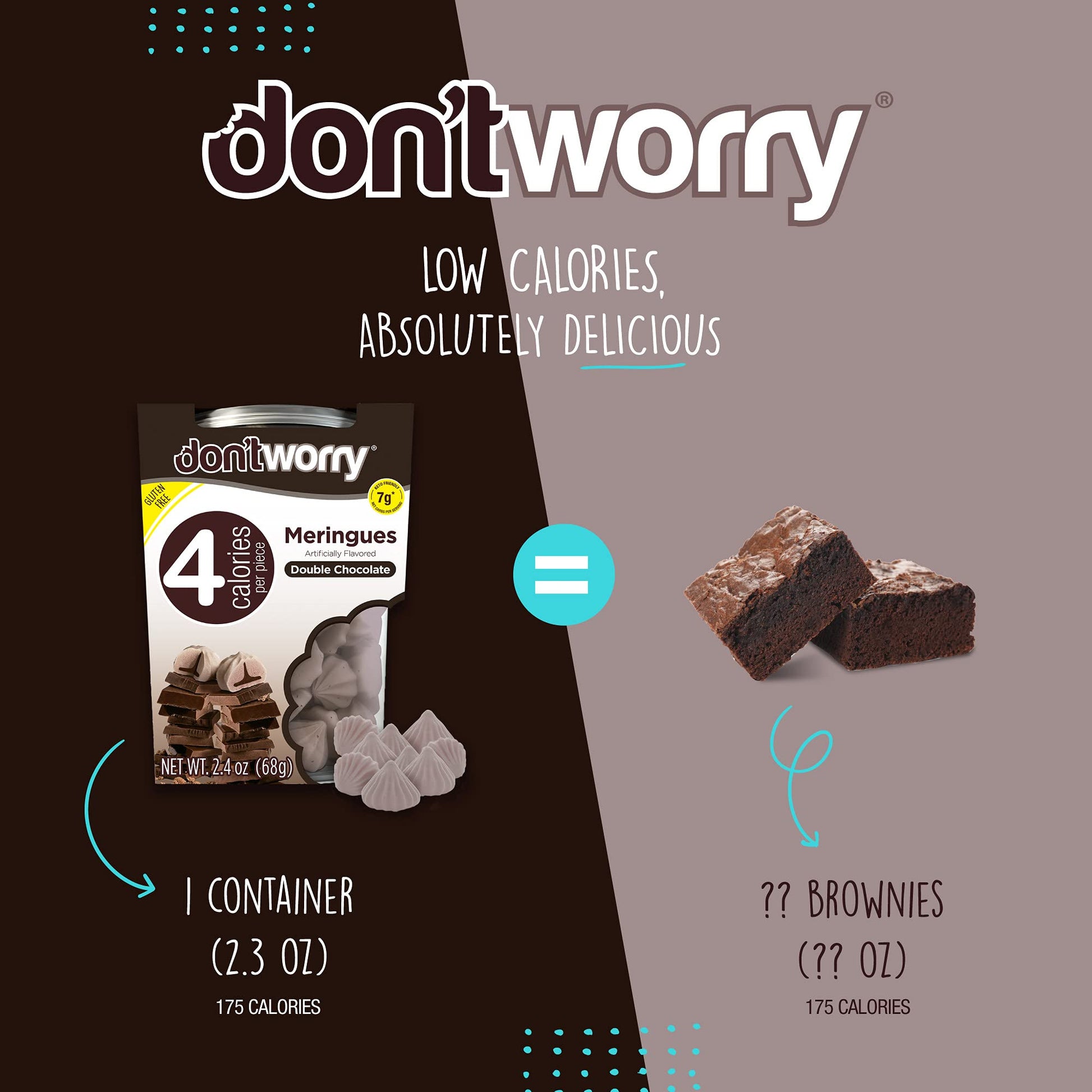 • Q: What are the main benefits of Don't Worry Meringue Cookies? A: Don't Worry Meringue Cookies are keto-friendly, containing only 4 calories per piece, making them a great guilt-free snack option. They are gluten-free, low in sugar, and made with natural alternatives, ensuring you can indulge without compromising your health goals.