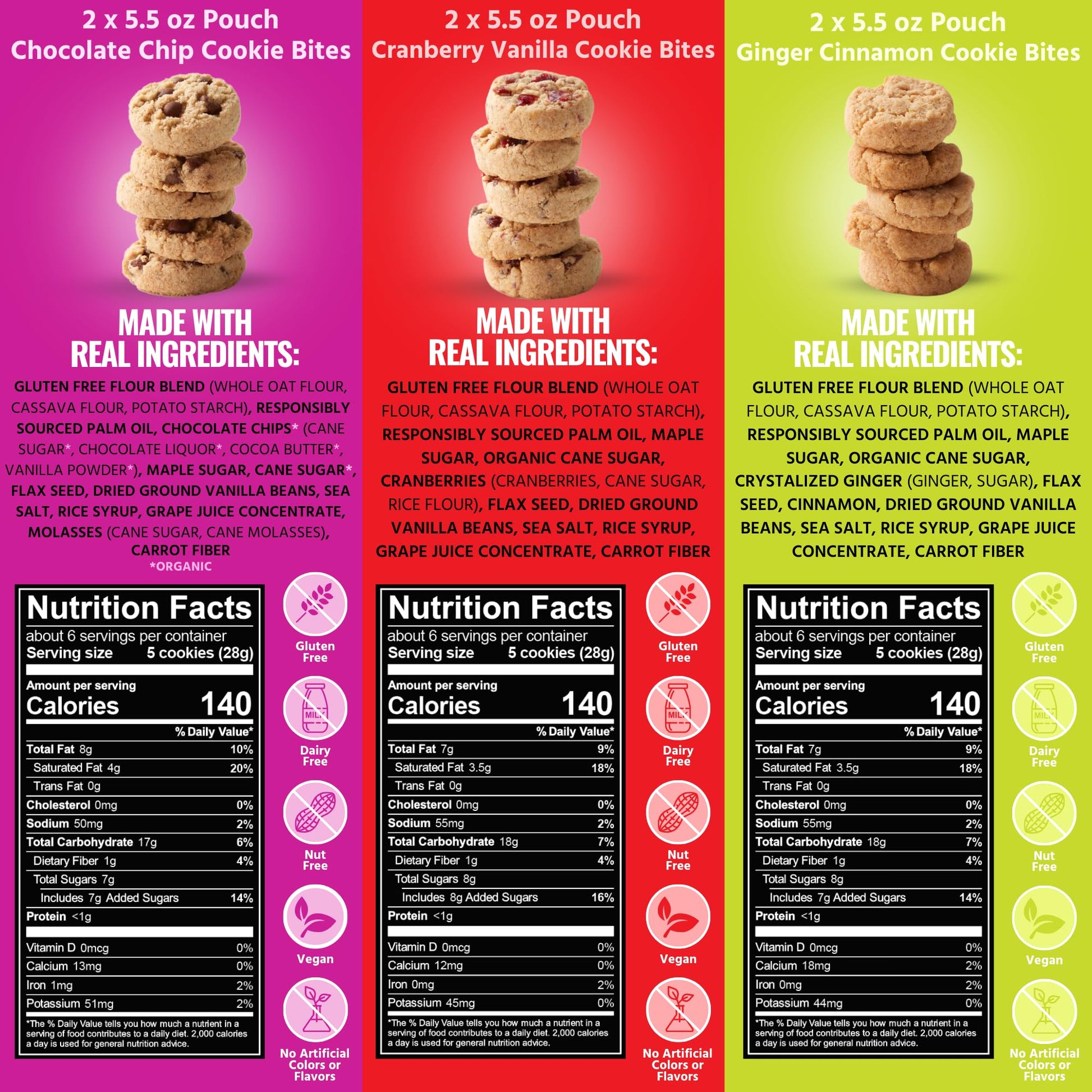 Each Flavor Offers Its Own Unique Twist: Chocolate Chip: Nostalgic Sweetness With Melt-In-Your-Mouth Chocolate Chips. Ginger Cinnamon: Warm, Subtly Spiced Flavors With A Zesty Ginger Kick. Cranberry Vanilla: A Perfect Balance Of Tangy Cranberries And Smooth Vanilla. Crafted From Premium, Simple Ingredients, Our Cookie Bites Are Free From The Top 14 Allergens, Corn, And Seed Oils. Theyre Vegan, Gluten-Free, Non-Gmo, And Made In A Dedicated Allergy-Friendly Facility To Ensure Safety And Quality In Every Bite.