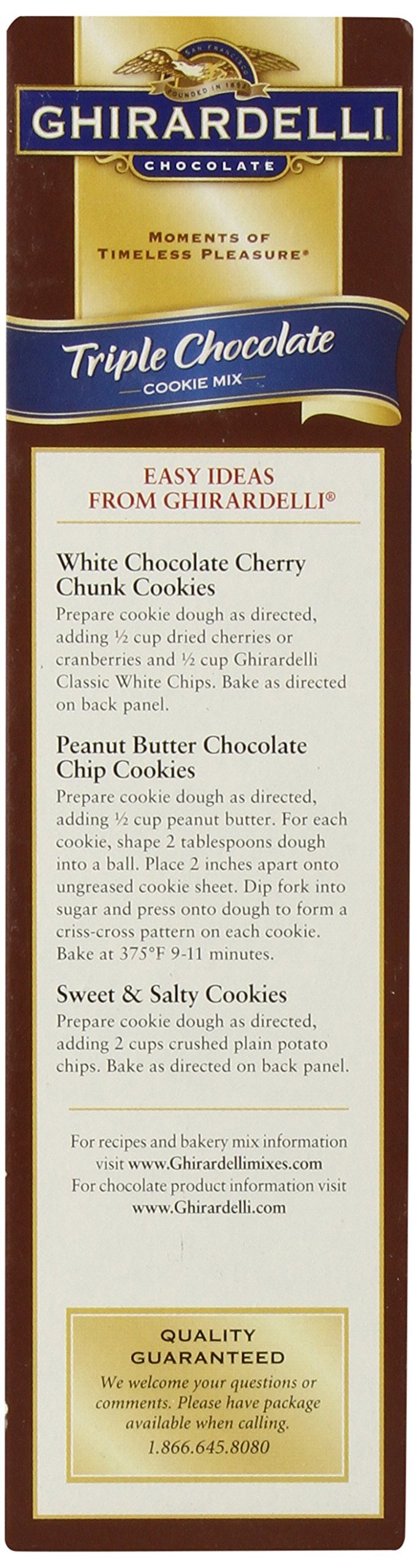 ghirardelli triple chocolate semi-sweet, milk, bittersweet cookie mix, 52, 5 oz. Makes 3 batches.3 kinds of rich chocolate chips.add egg and butter