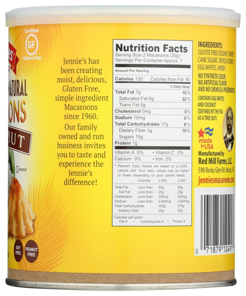 Save On Jennies Macaroons 12X 8 Oz coconut Macaroon cnstr gluten Free Only Jennies Macaroons Provide My Patients With Readily Available Source Of Lauric Acid For Their Diets, Which Is Easy To Eat And Is Preservative-Free And Additive-Free.ItS All Natural.A And It Is Delicious, As WellA : gluten Free Kosher (Note: This Product Description Is Informational Only. Always check The Actual Product Label In Your Possession For The Most Accurate Ingredient Information Before Use. For Any Health Or Dietary Related Matter Always consult Your Doctor Before Use.)