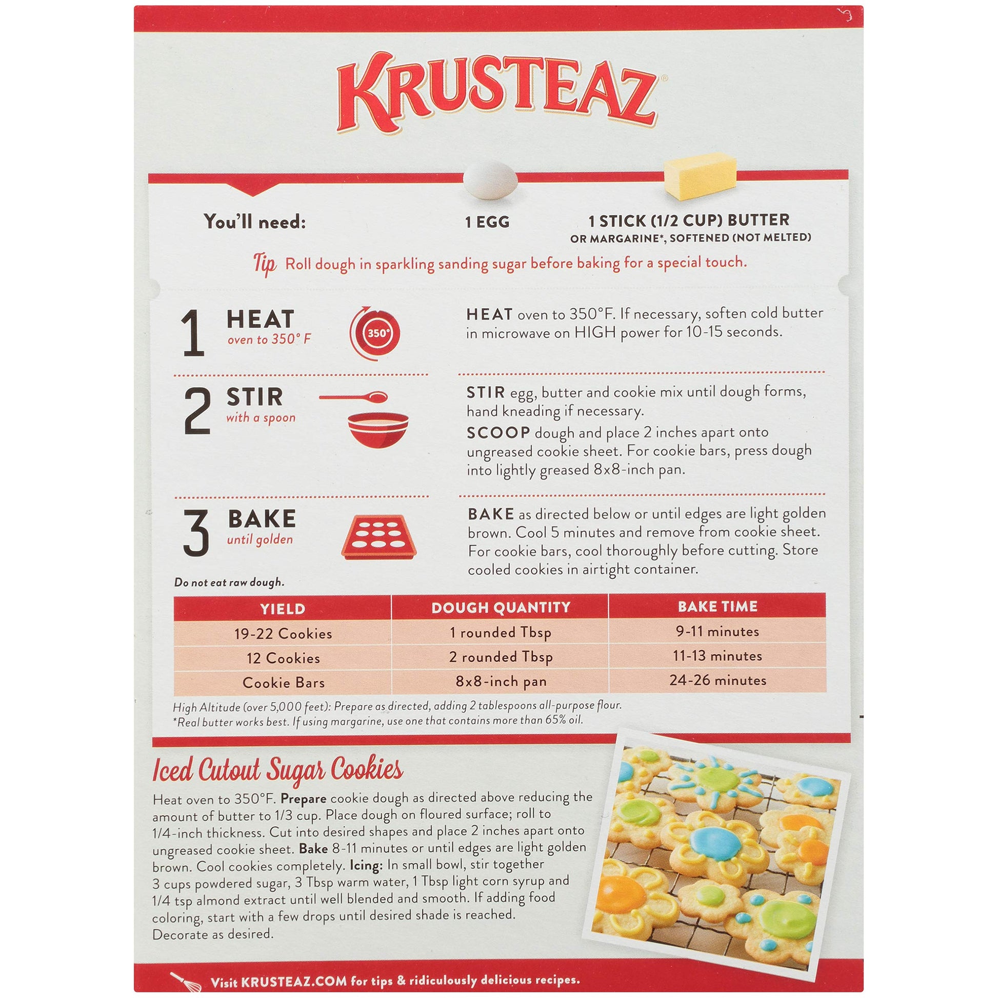 - Q: How do I prepare the Krusteaz Cookie Mix? A: To prepare the Krusteaz Butter Vanilla Sugar Cookie Mix, simply heat your oven to 350°F, mix together one egg, butter, and the cookie mix until a dough forms, then scoop or press into your desired cookie shape and bake until light golden brown.