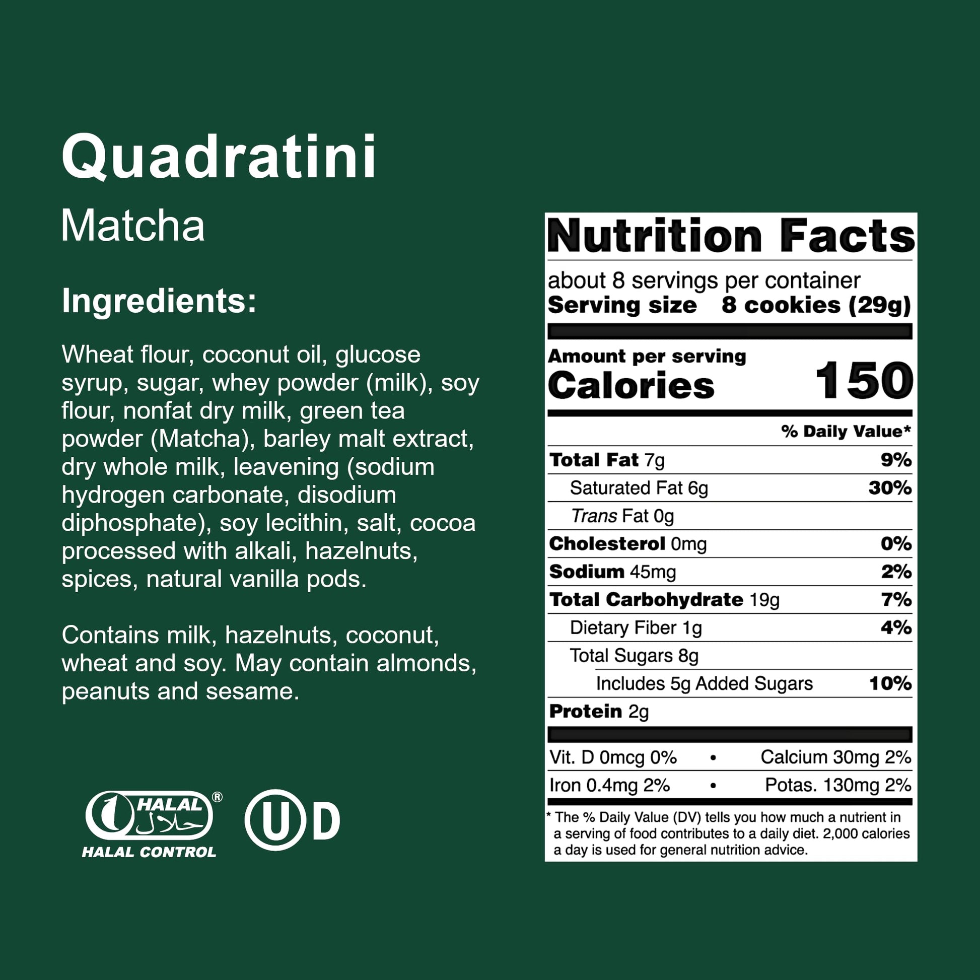 - Q: What are the main ingredients in Loacker Quadratini Matcha green tea wafer cookies? A: Loacker Quadratini Matcha green tea wafer cookies are made with high-quality ingredients, including pure matcha from Japan, Italian hazelnuts, Bourbon vanilla, cocoa, and fresh mountain water. They contain no hydrogenated fats, artificial flavorings, or preservatives.