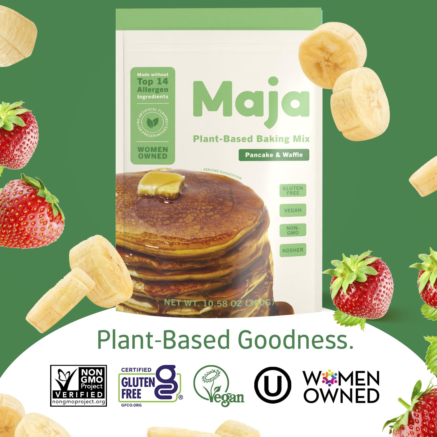 Q: What dietary needs does the Maja Pancake Mix cater to?A: The Maja Pancake Mix is vegan, gluten-free, allergen-free, Non-GMO, and kosher, making it accessible for a variety of dietary preferences and restrictions.
