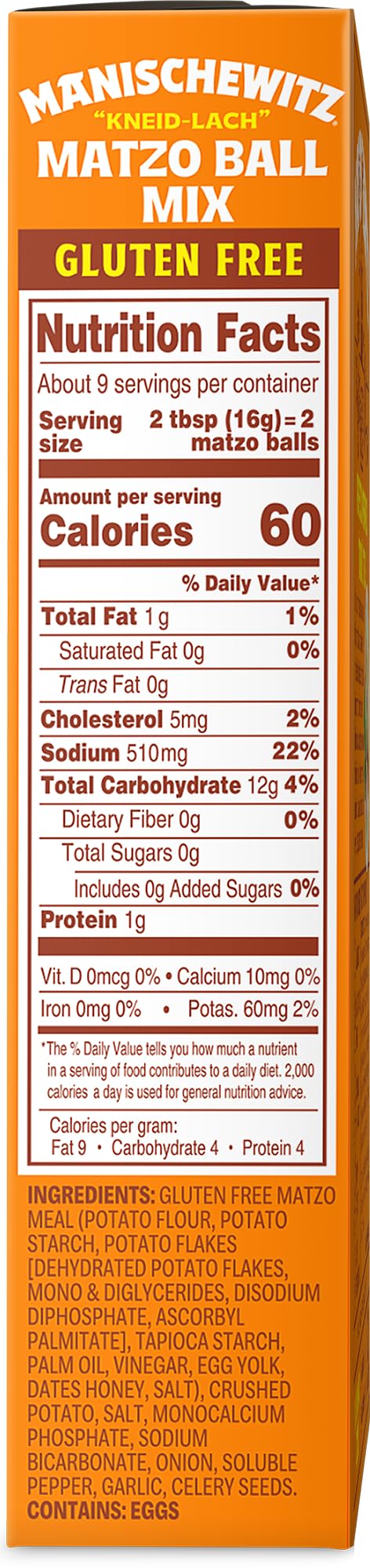 Q: What is the shelf life of Manischewitz Gluten Free Matzo Ball Mix?A: The shelf life of Manischewitz Gluten Free Matzo Ball Mix is generally indicated on the package. It's best to check the expiration date to ensure freshness.