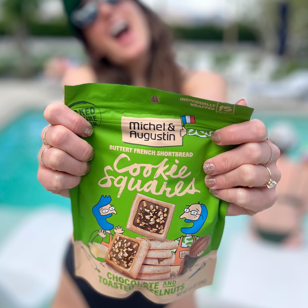 Q: What are Michel et Augustin Cookies made of?A: Michel et Augustin Cookies are crafted using natural ingredients, including butter, hazelnut chocolate ganache, and real bits of toasted hazelnut, without added preservatives, artificial flavors, or GMOs.
