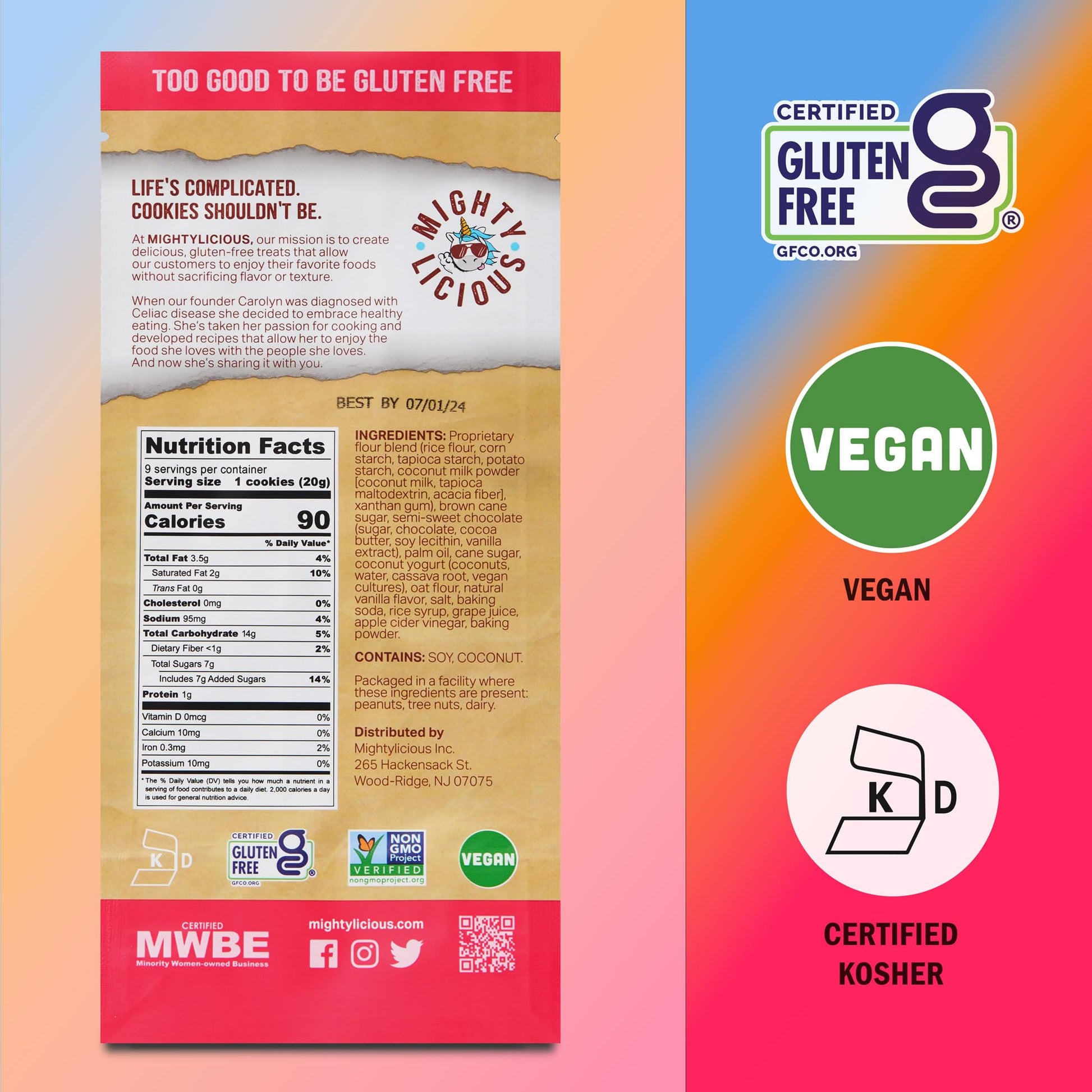 Q: Are MIGHTYLICIOUS Vegan Chocolate Chip Cookies gluten-free?A: Yes, MIGHTYLICIOUS Vegan Chocolate Chip Cookies are gluten-free, making them a great snack option for those with gluten sensitivities or celiac disease.