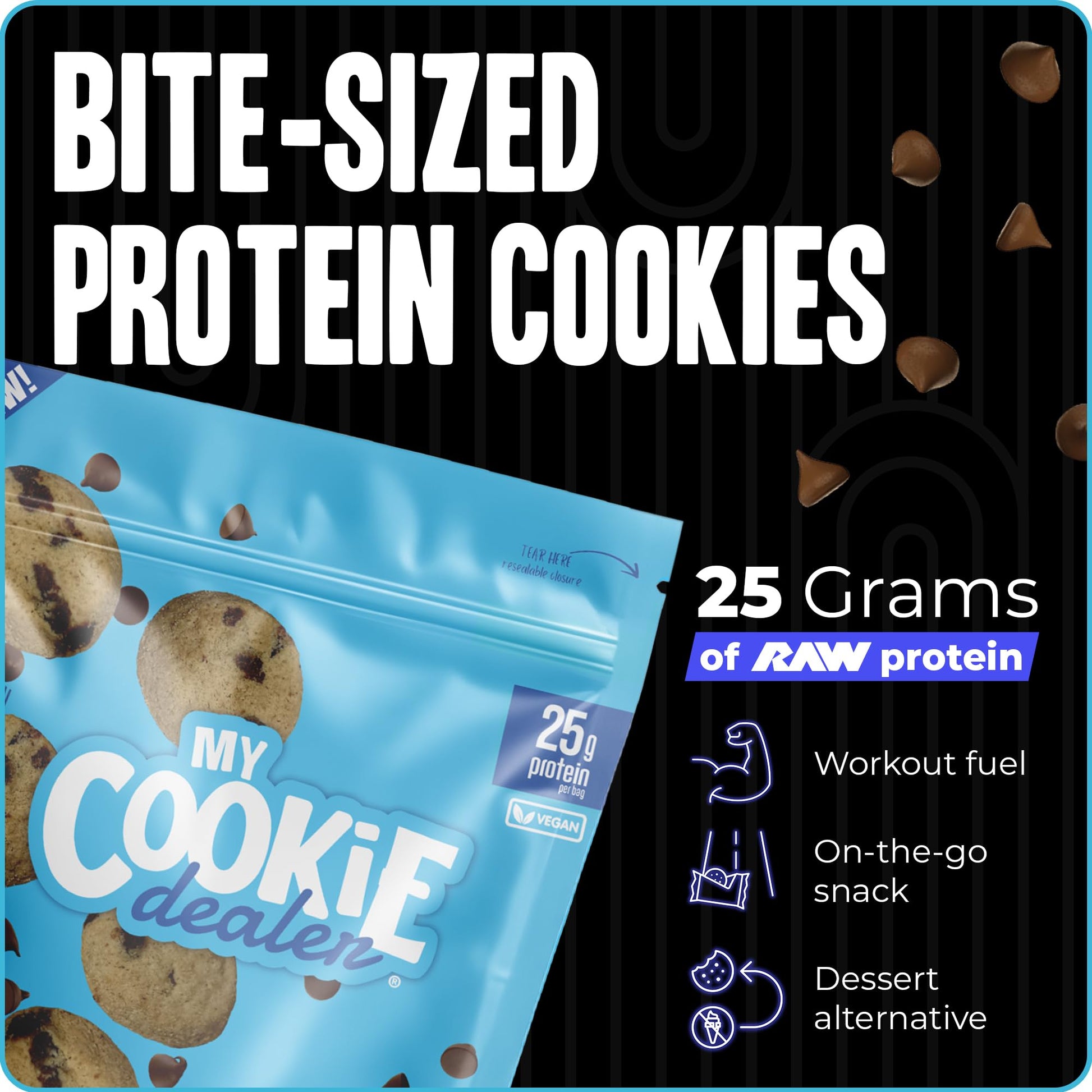 Cop Your Protein Fix: My Cookie Dealer Bite-Sized Protein Cookies Deliver A Delicious And Nutritious Treat That'S Perfect For Any Time Of Day. Whether You'Re Craving A Satisfying Post-Workout Snack Or Searching For A Dessert Alternative Packed With Protein, Look No Further. 25 Grams Of Protein Per Resealable Bag. 6 Pack Of 5 Oz Bag Of Crunchy Bite-Sized Chocolate Chip Protein Cookies.