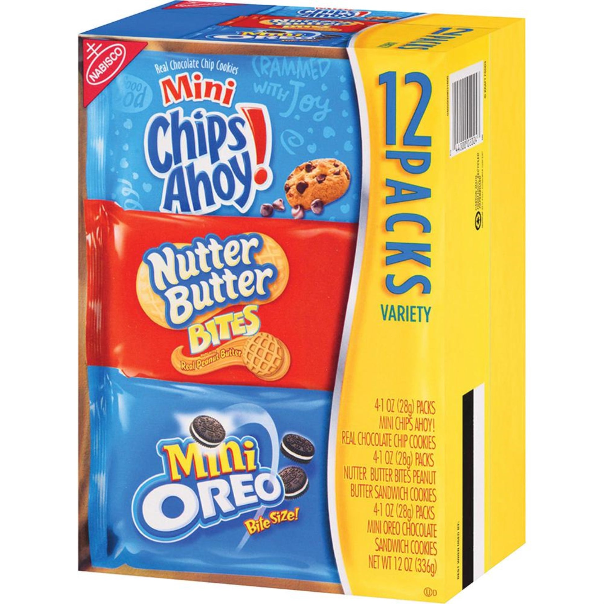 Q: How many cookie packs are in each Mini Variety Pack?A: Each Mini Variety Pack contains a total of 12 individually packaged snacks, with 4 packs each of OREO Mini, Nutter Butter Bites, and CHIPS AHOY! Mini.
