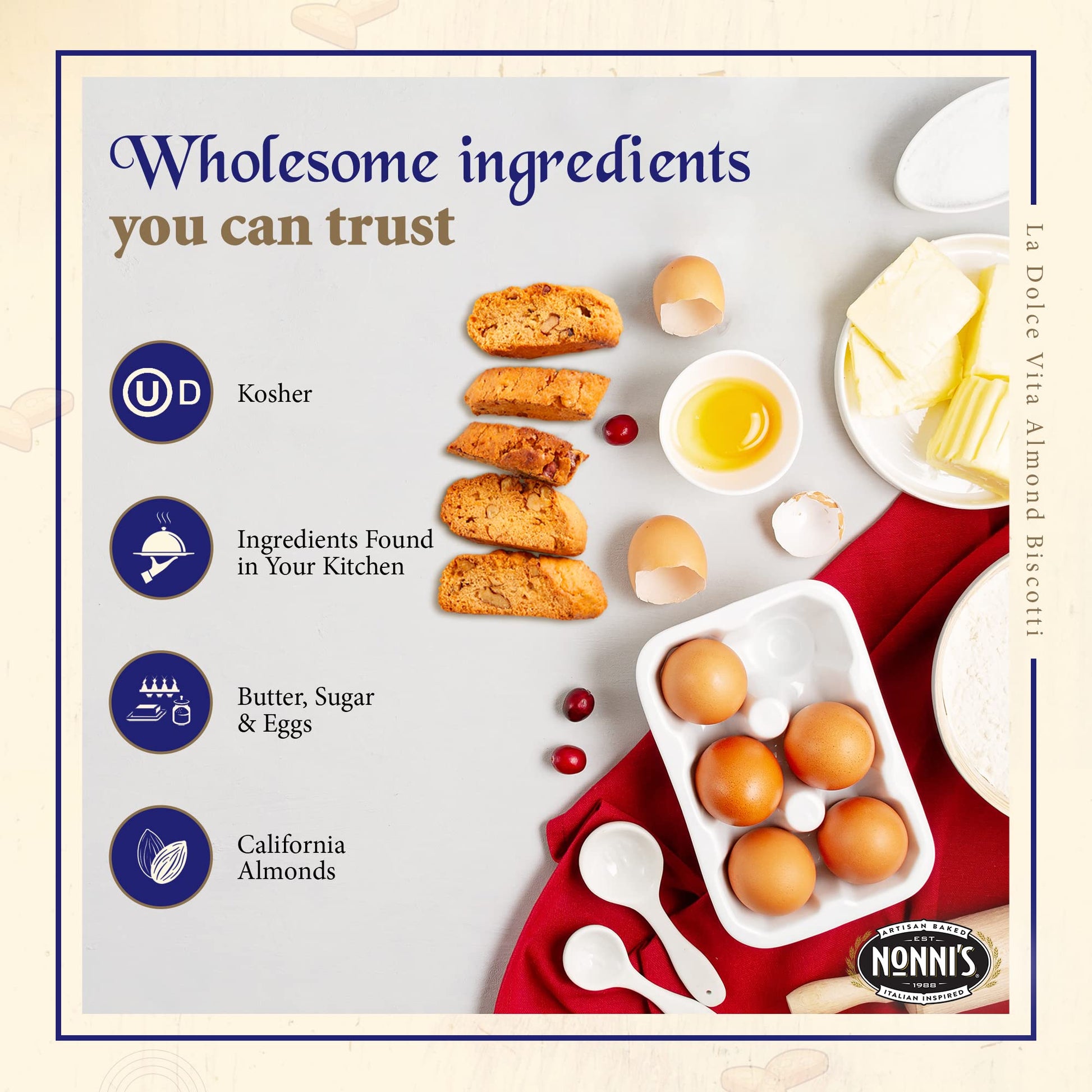 The Exceptional Taste And Quality Of All Nonnis Biscotti Cookies Start With Traditions That Go Back To The Hills Of Tuscany. Everything We Do Is Rooted In The Old Country'S Simple, Tried And True Techniques. Youll Love These Sweet, Twice-Baked Slices Of Biscotti Heaven. Product Highlights: Delicious Almond Flavor - These Almond Biscotti Come Packed With Flavor And Crunch. Premium Ingredients - Each Cookie Is Made Using Only The Freshest Ingredients. Enjoy This Sweet And Delicious Twice-Baked Slice Of Heaven! Makes The Perfect Treat - Searching For The Perfect Birthday, Christmas, Or Anytime Treat? Look No Further! Your Friends And Family Will Love These Almond Biscotti Cookies. 34 Ounce Biscotti Jar - Theres Plenty For Everyone With This 34-Ounce Jar! Biscotti Lovers Tips: Enjoy Your Favorite Nonnis Biscotti Cookie Alone Or With Your Favorite Specialty Coffee Or Tea. Try Serving Your Favorite Biscotti Cookies With Ice Cream, On The Side Of A Fresh Fruit Platter, In A Parfait, Or Experiment With Your Favorite Charcuterie Board. The Options Are Limitless! Check Out Nonnis Brand For More Of Our Sweet Tasty Treats And Holiday Treat Baskets.