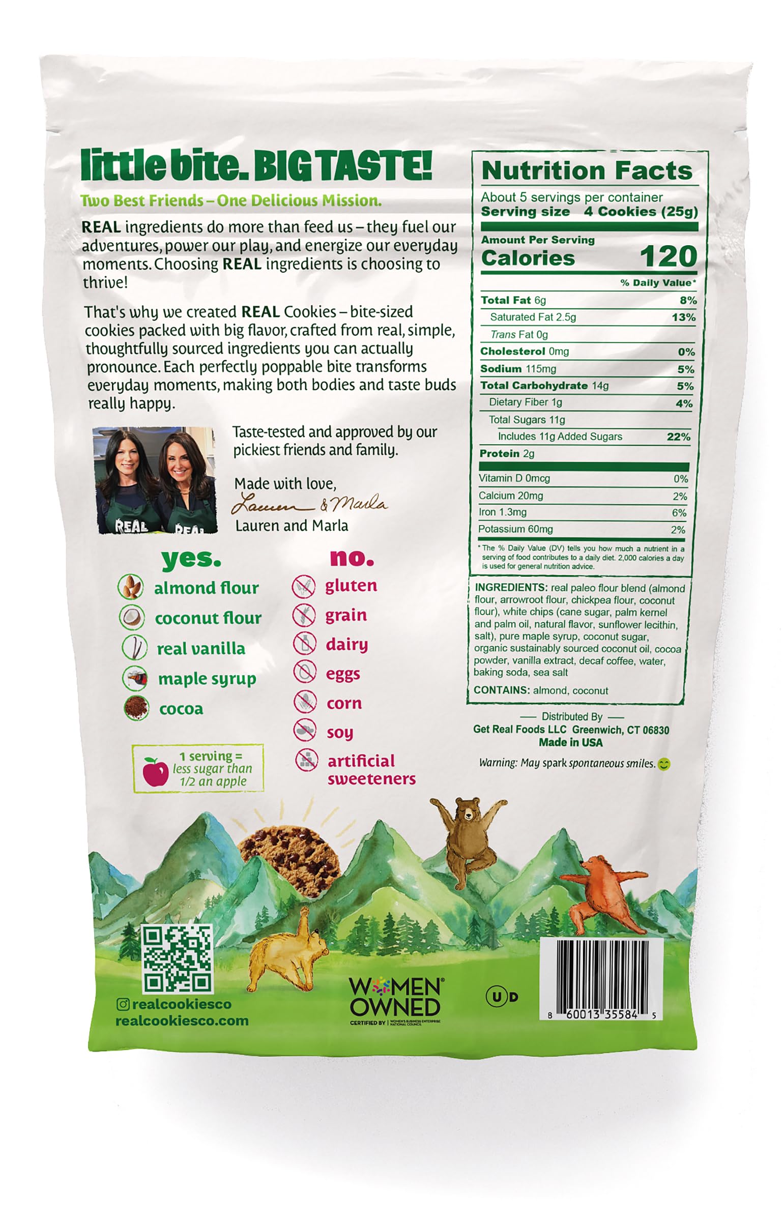 Q: What ingredients are used in these cookie poppers?A: These cookie poppers are made with almond and coconut flours, rich cocoa, real vanilla, and sweetened with pure Vermont maple syrup, ensuring no refined sugars or artificial ingredients.