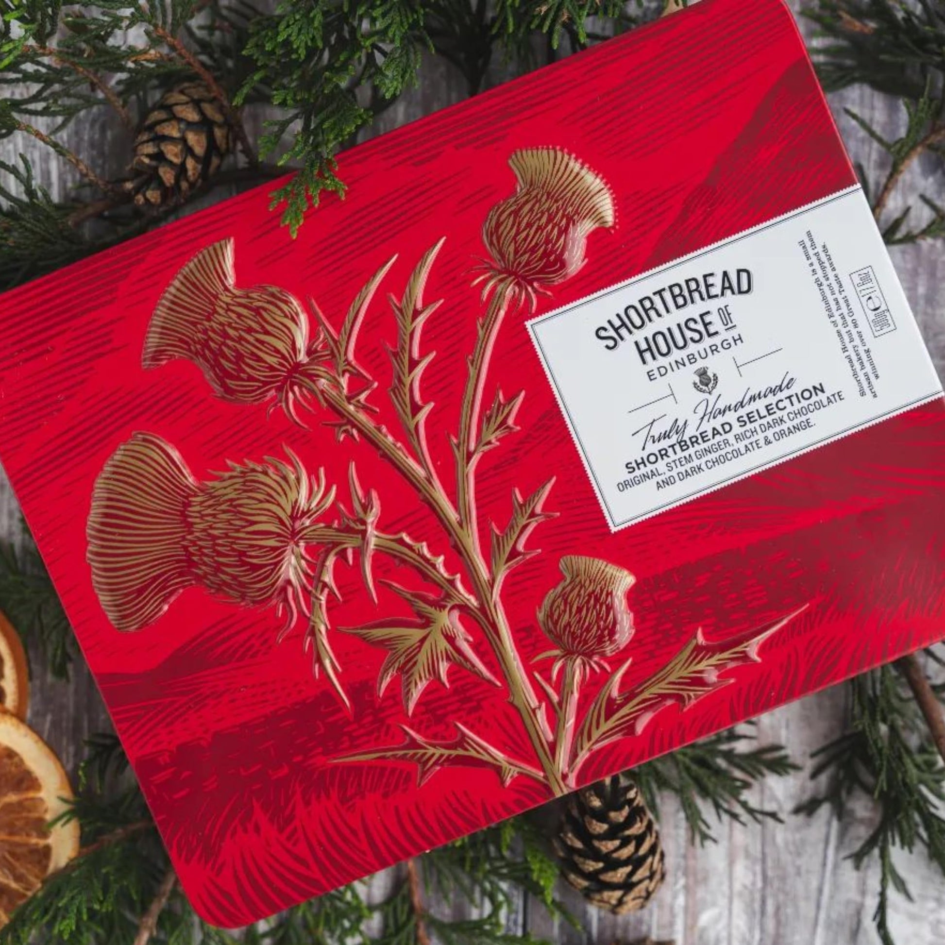 Q: What flavors are included in the Shortbread House of Edinburgh selection tin?A: The selection tin contains a variety of flavors, including Original, Stem Ginger, Rich Dark Chocolate, and Dark Chocolate & Orange, allowing you to enjoy a delightful range of tastes.