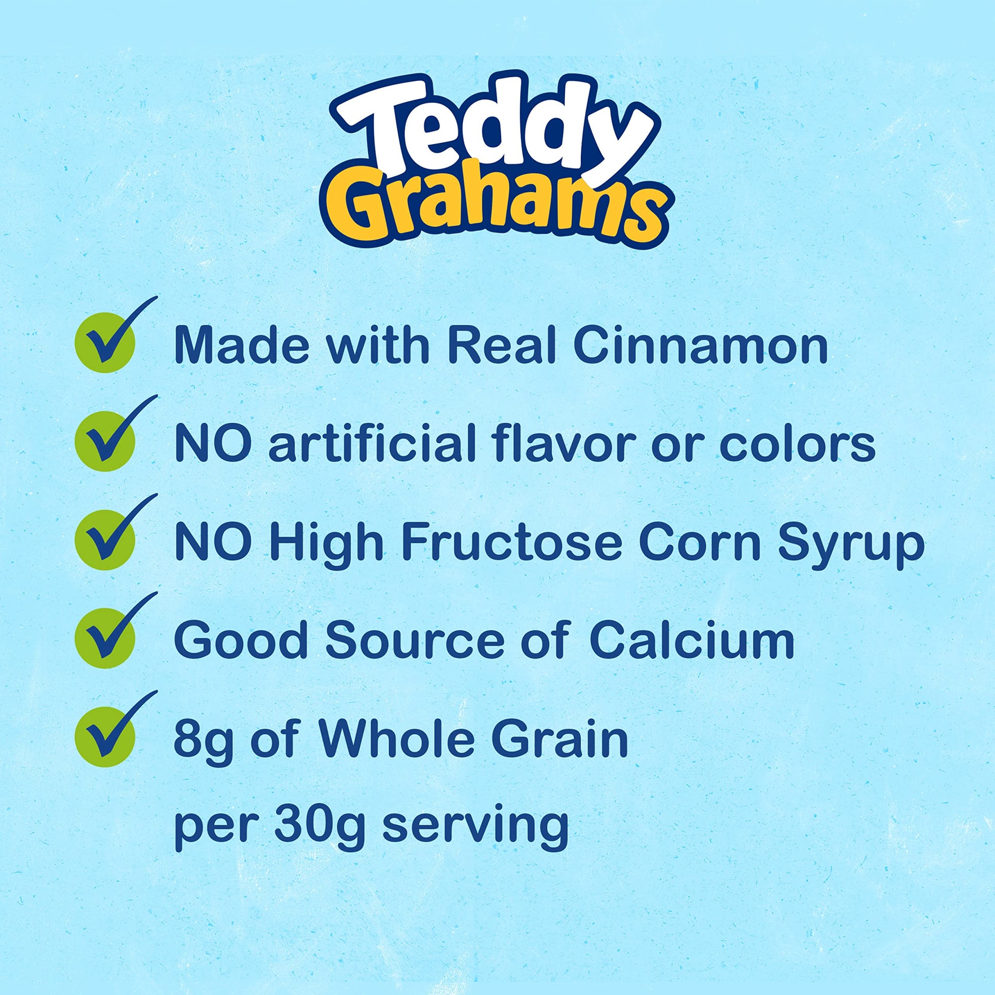- Q: What are Teddy Grahams Cinnamon Graham Snacks made of? A: Teddy Grahams Cinnamon Graham Snacks are made with high-quality ingredients, including whole grain, and contain no high fructose corn syrup or artificial flavors and colors. Each serving provides a delicious cinnamon flavor along with 8 grams of whole grain and a good source of calcium.
