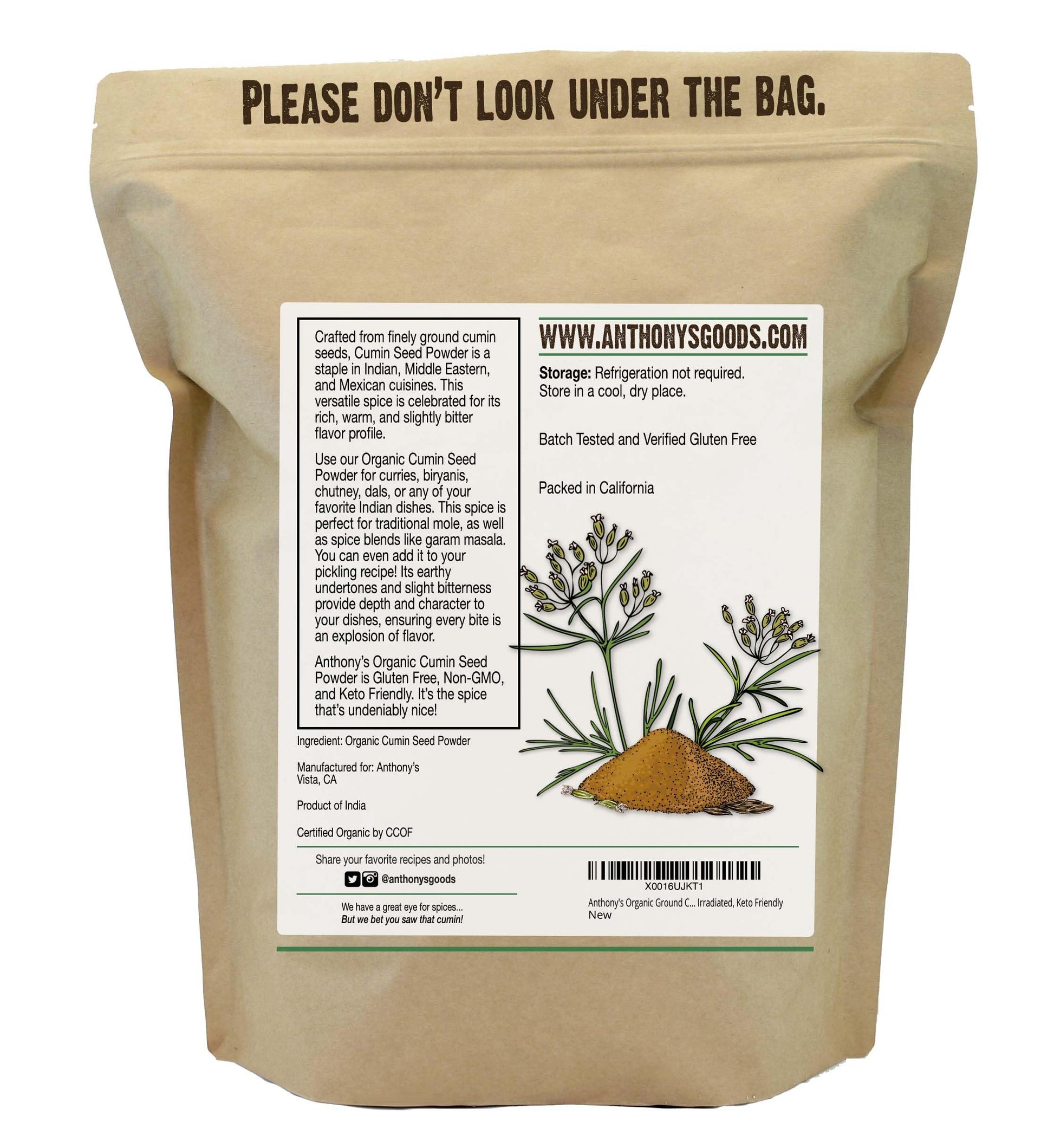 - Q: What is the size of the packaging for Anthony's Organic Ground Cumin? A: Anthony's Organic Ground Cumin is available in a one-pound resealable bag, which helps maintain freshness.