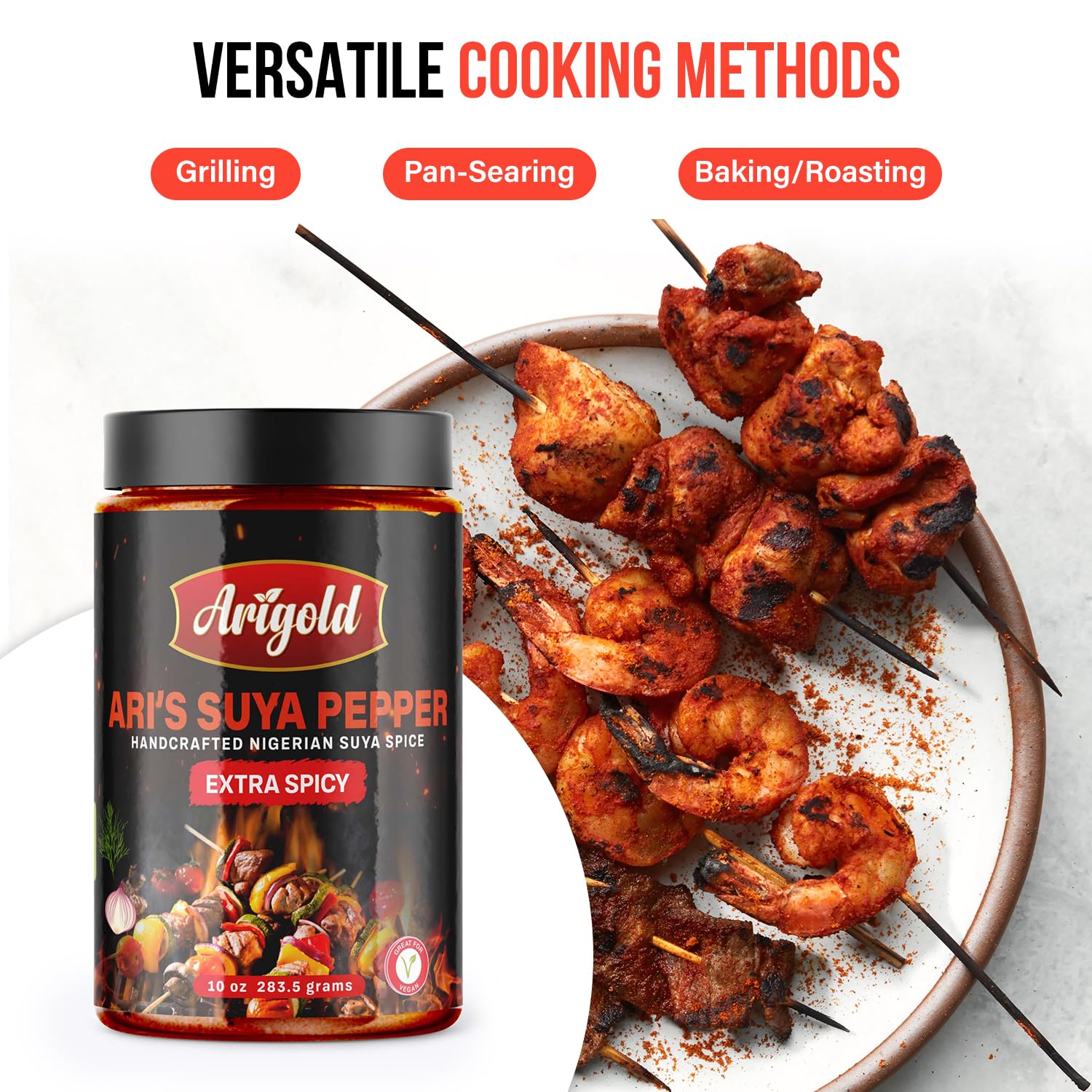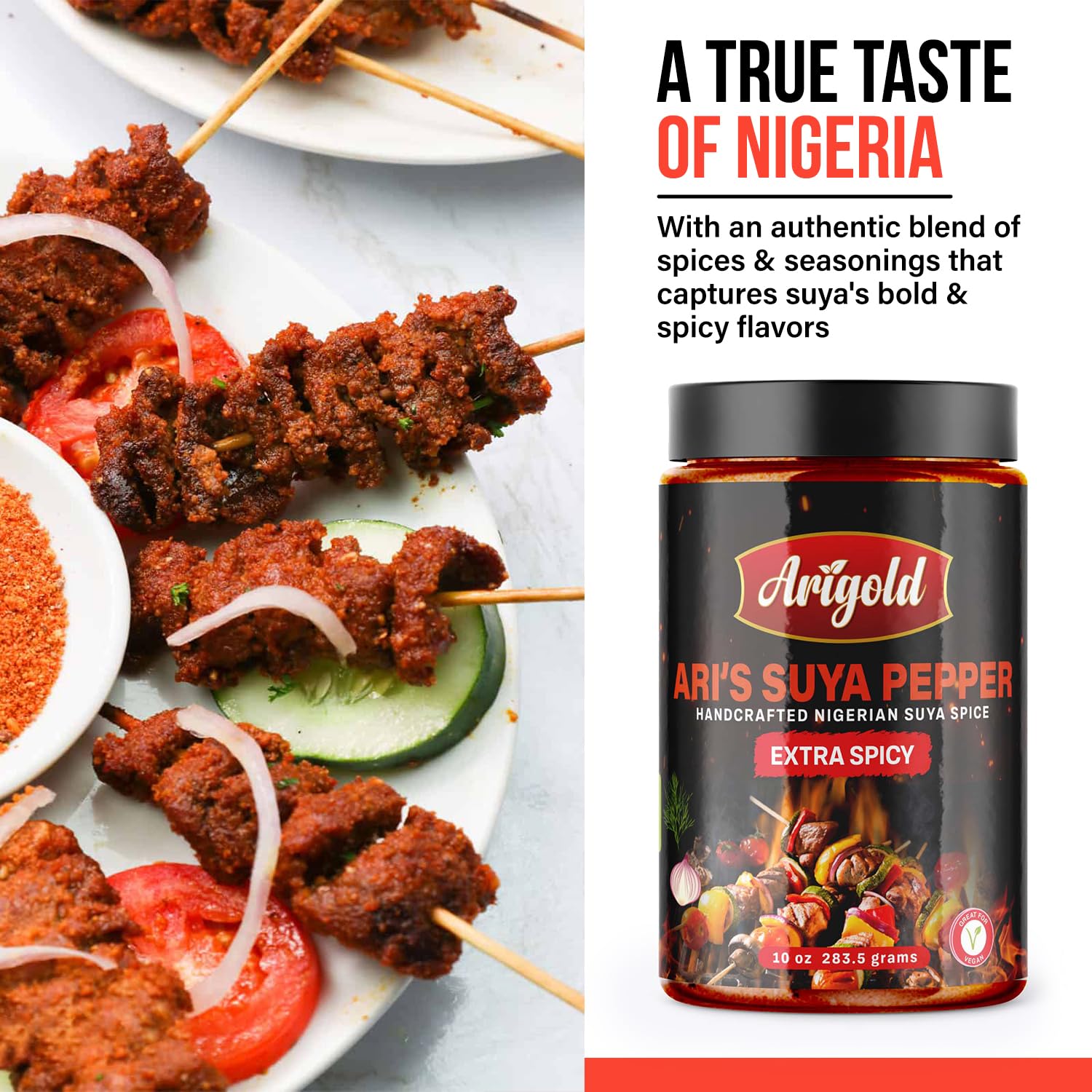 - Q: How spicy is Arigold Suya Pepper? A: Arigold Suya Pepper is classified as extra spicy, providing a bold and smoky flavor with a significant level of heat. It is crafted to deliver the traditional flavors of Nigerian suya while being enjoyable for those who appreciate spicy foods.