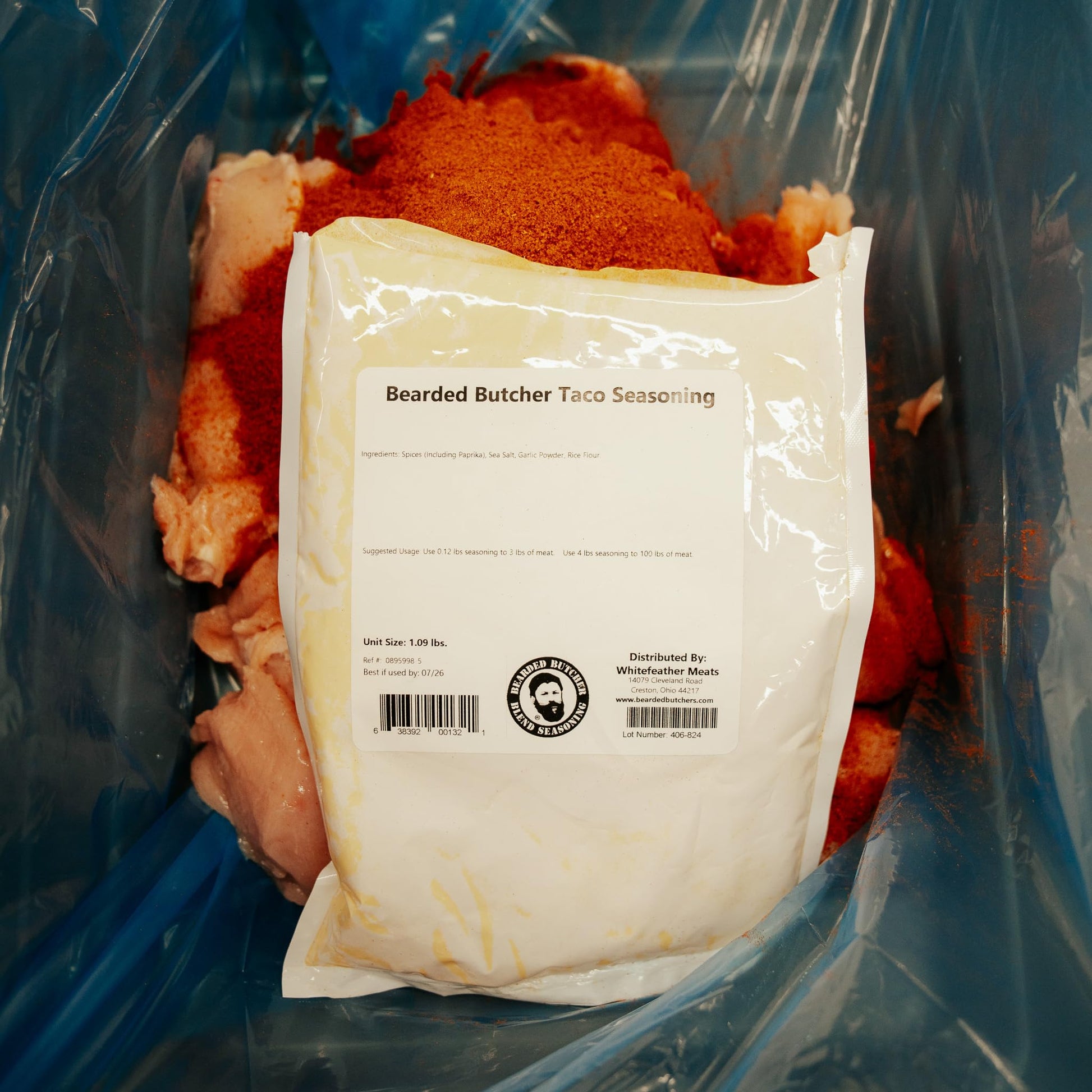 - Q: What is the size of the Bearded Butchers Taco Seasoning package? A: Bearded Butcher Taco Seasoning is available in a seventeen and a half ounce bag, providing ample seasoning for up to twenty-five pounds of meat.