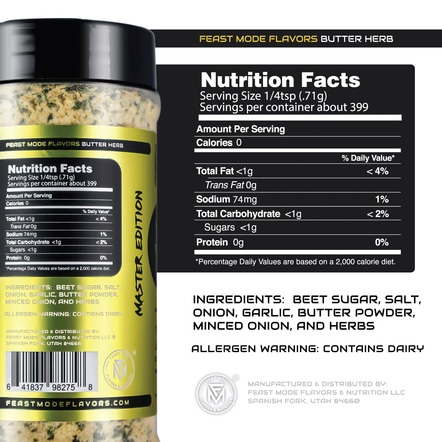Butter Herb Seasoning Master Edition - Twice The Flavor, Makes Double The Gainz! 10 Oz Bottle Ingredients: Beet Sugar, Salt, Onion, Garlic, Butter Powder, Minced Onion, And Herbs Allergen Warning: Contains Milk Product Nutritional: Serving Size 1/4 Teaspoon Calories 1, Fat 0G, Sodium 74 Mg, Carbohydrates 0G, Protein 0G. Feast Mode Flavors Butter Herb Seasoning - Master Edition Is Now Available In A Double-Sized Bottle, Giving Fitness Enthusiasts, Meal Preppers, And Culinary Pros More Of The Bold, Buttery Goodness They Love. This Handcrafted Blend Combines Rich, Savory Butter Flavor With A Perfect Balance Of Garlic, Onion, And Aromatic Herbs To Elevate Any Dish-Without The Excess Sodium, Calories, Or Artificial Additives. Designed For Those Who Refuse To Sacrifice Taste While Staying Committed To Their Nutrition Goals, This Seasoning Is Low Sodium, Zero Calorie, And Completely Free From Artificial Fillers, Binders, Msg, And Dyes. Versatile And Delicious, Butter Herb Seasoning Enhances Everything From Grilled Chicken, Lean Steak, And Roasted Vegetables To Eggs, Pasta, Seafood, And Even Popcorn. Whether You'Re Meal Prepping For The Week, Crafting Clean-Eating Recipes, Or Just Looking For A Guilt-Free Way To Add Rich, Buttery Flavor To Your Favorite Foods, This Master Edition Bottle Ensures You Never Run Out Of Your Go-To Seasoning. As A Family-Owned Business Based In Utah, Feast Mode Flavors Has Spent Nearly A Decade Perfecting Bold, Clean Seasonings That Fuel Active Lifestyles And Support Healthy Eating Without Sacrificing Taste. Our Master Edition Is Designed To Meet The High Demands Of Athletes, Bodybuilders, Fitness Enthusiasts, And Clean Eaters-Because Great Nutrition Should Always Come With Great Flavor. Keywords: Butter Herb Seasoning | Low Sodium Seasoning | Zero Calorie Seasoning | Healthy Seasoning Blends | Bulk Seasoning For Fitness | Meal Prep Seasonings | Bodybuilding Seasoning | Keto-Friendly Spices | Gluten-Free Seasonings | Sugar-Free Spice Blend | Clean Eating Spices | Msg-Free Seasonings | Paleo Seasoning | Whole30 Approved Seasoning | Best Seasoning For Chicken | Butter Flavored Spice Blend | Healthy Butter Alternative | Seasoning For Athletes | Competition Prep Seasonings | Protein Seasoning | Fitness Meal Seasonings | Weight Loss Friendly Spices | Premium Spice Blend | High-Protein Diet Seasonings | Best Low Sodium Spice | Natural Spice Blend | Handcrafted Seasonings | Utah-Based Spice Company | Family-Owned Spice Business | Gym Meal Prep Seasoning | Seasoning For Lean Meals | Spice Blend For Weightlifters | Healthy Herbs And Spices | Artificial-Free Seasoning | Seasoning For Meal Preppers | Best Spice For Roasted Vegetables | Diet-Friendly Seasoning | No Salt Added Spices | All-Natural Seasonings | Seasoning For Grilled Meats | Fitness-Friendly Spice Mix | Spice Blend For Chicken And Fish | Cooking With Low Sodium Spices | Gourmet Butter Herb Seasoning | Sugar-Free Cooking Spices | Best Seasoning For Dieting | Low Sodium Butter Flavor | Fitness Seasoning Bulk | Protein-Packed Meal Prep Spices | Macros-Friendly Seasoning | Gym-Friendly Seasoning Blend | Workout Meal Spices