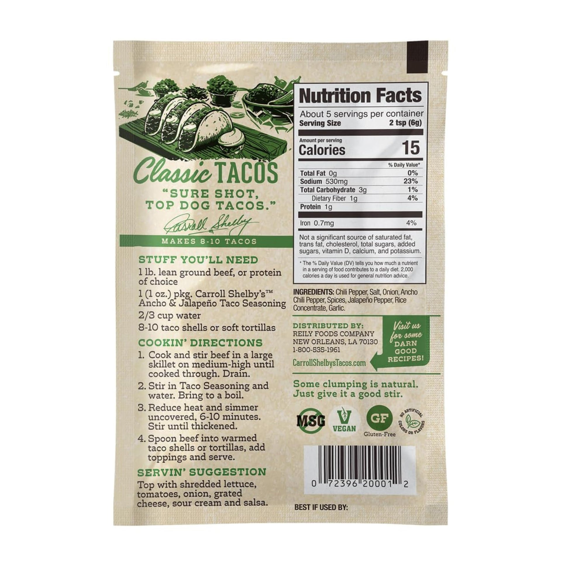 Q: How long does it take to prepare tacos using this seasoning?A: With Carroll Shelby's Original Texas Brand Ancho & Jalapeño Taco Seasoning, you can prepare tasty tacos in just 15 minutes, making it a great option for quick weeknight dinners or last-minute meals.