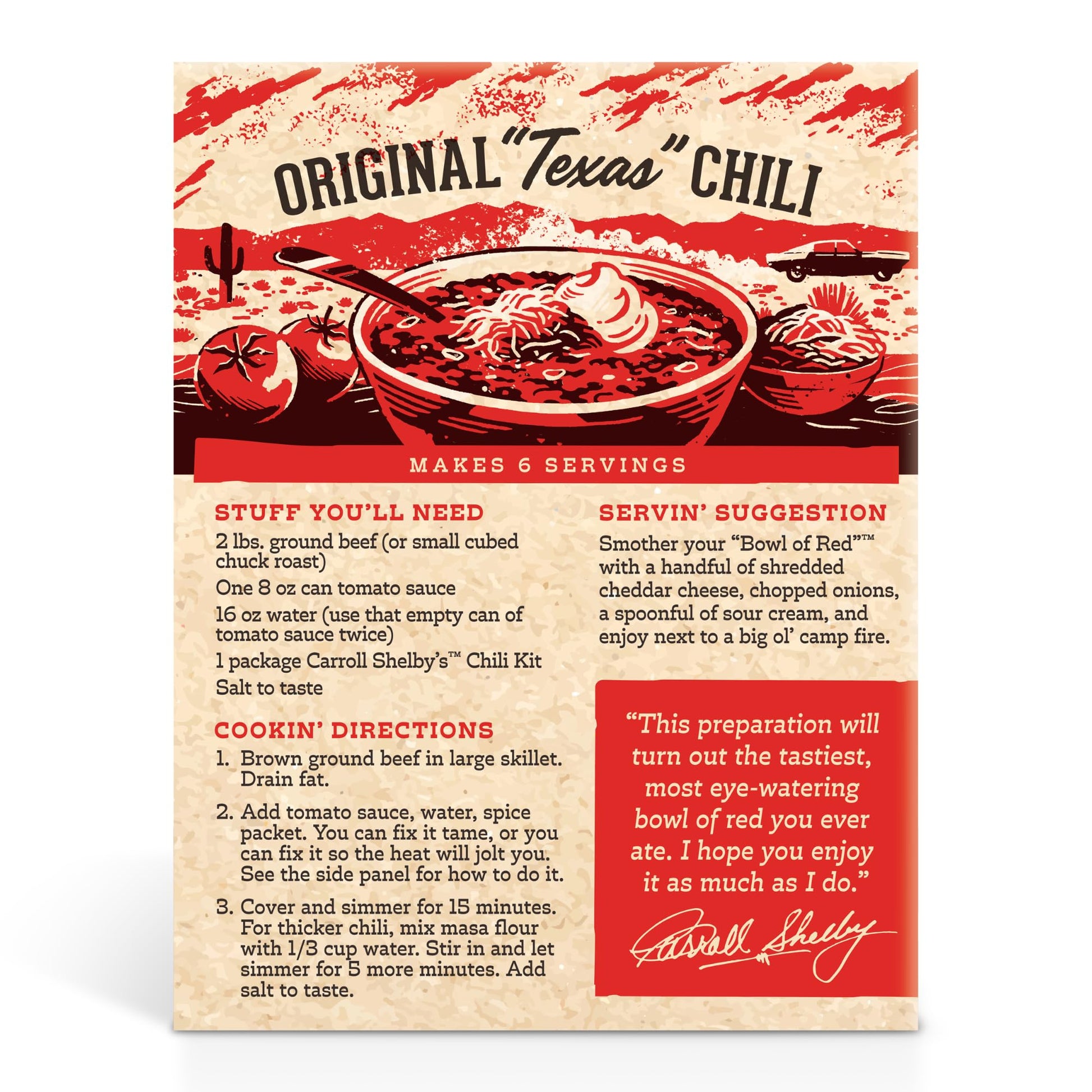 Carroll Shelby'S Custom Chili Kit Features Individual Packets Of Spices, Cayenne, And Masa Flour That Let You Season Two Pounds Of Meat Just The Way You Like. Delicious On Its Own Or Atop Burgers, Tacos, Or Salads. Just Add Creativity And Your Own Special Fixin'S.