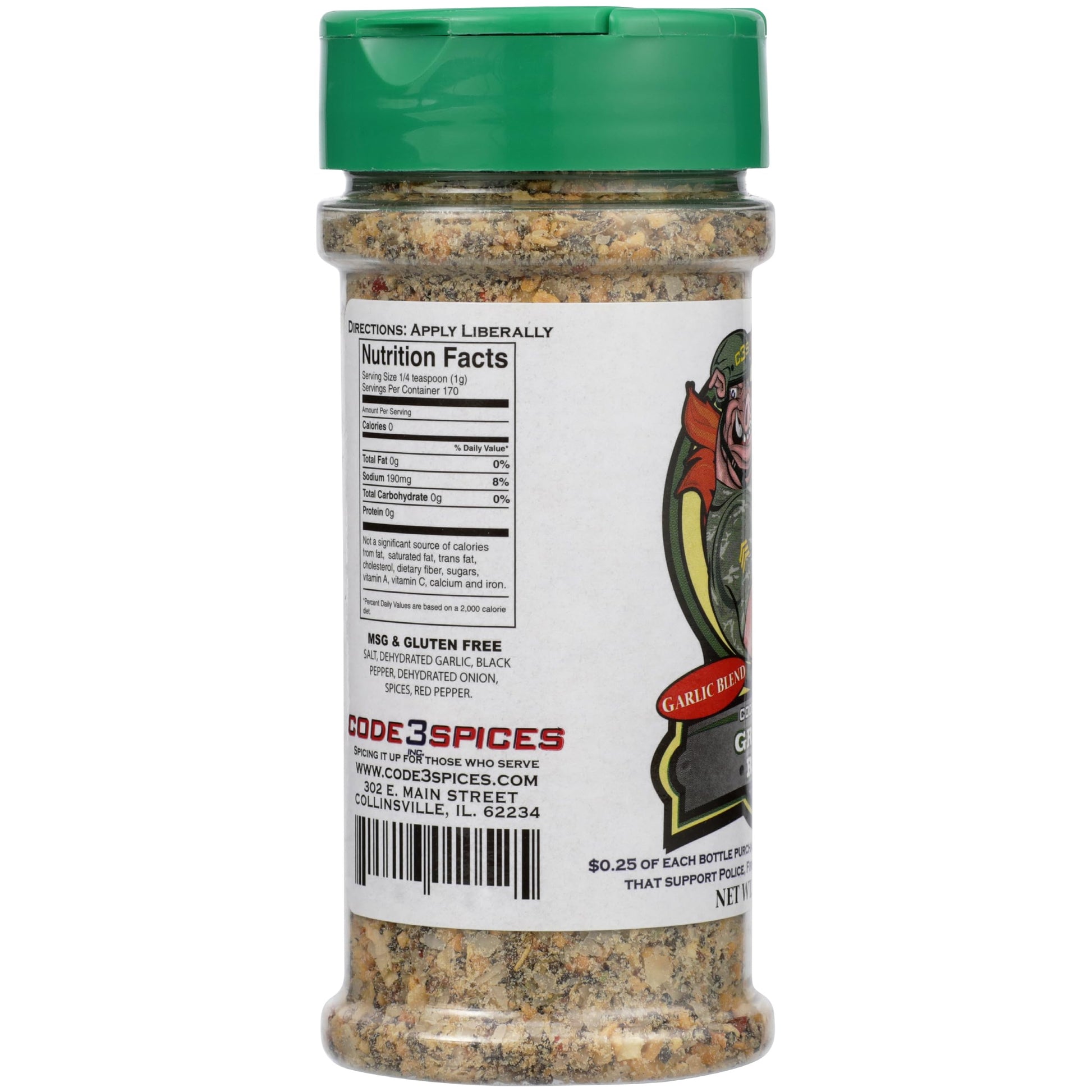 • Q: What is the size of the CODE 3 SPICES Grunt Rub package? A: The CODE 3 SPICES Grunt Rub comes in a 6-ounce package, which is ideal for a variety of cooking needs without taking up too much space in your pantry.