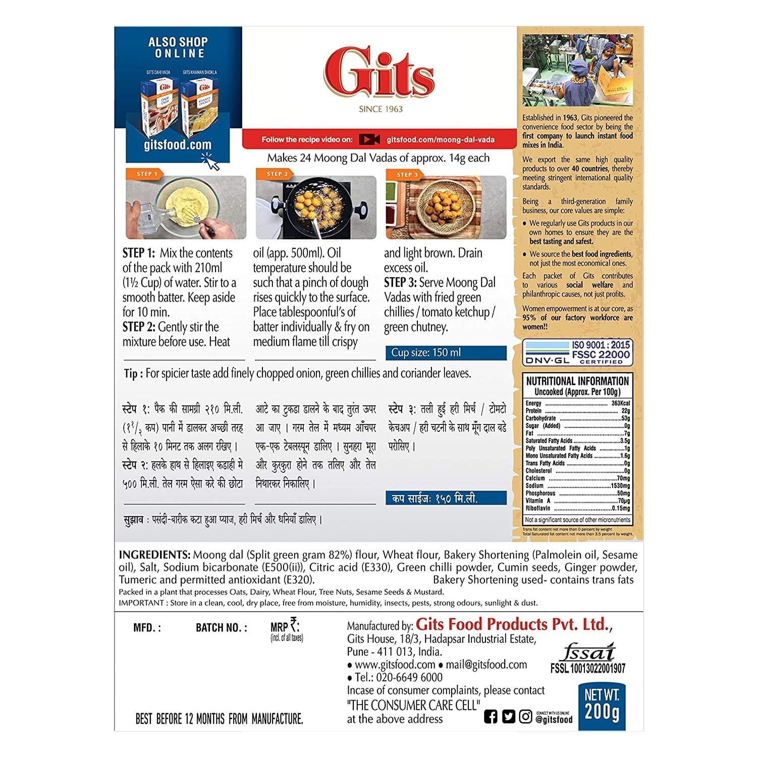 - Q: What is included in the Gits Instant Mix Box? A: The Gits Instant Mix Box includes three packets, each containing two hundred grams of instant mix, specifically designed for preparing Moong Dal Vada. This makes it convenient for quick meal preparation.